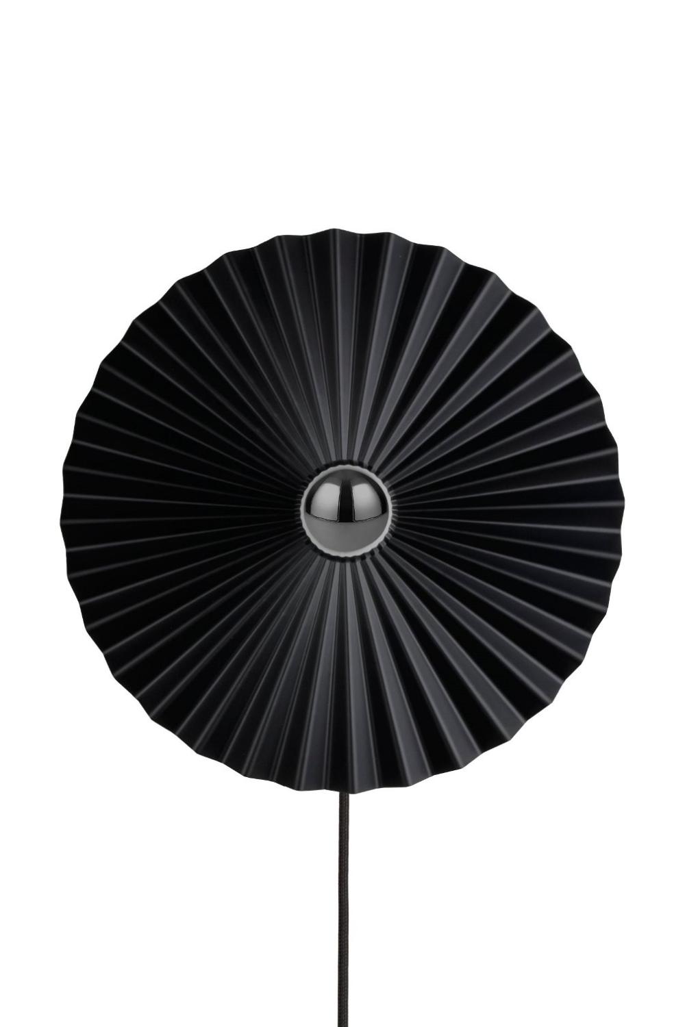 Plafond Omega från Globen Lighting har en elegant veckad skärm i mattsvart metall som blir en iögonfallande detalj i taket eller på väggen. För användning av lampan på vägg kan det vara fint med en toppförspeglad ljuskälla som reflekterar ljuset mot skärmen. Omega levereras med svart textilkabel och brytare för vägganslutning, medan kronkoppling för tak säljs separat. Ljuskälla ingår ej.
