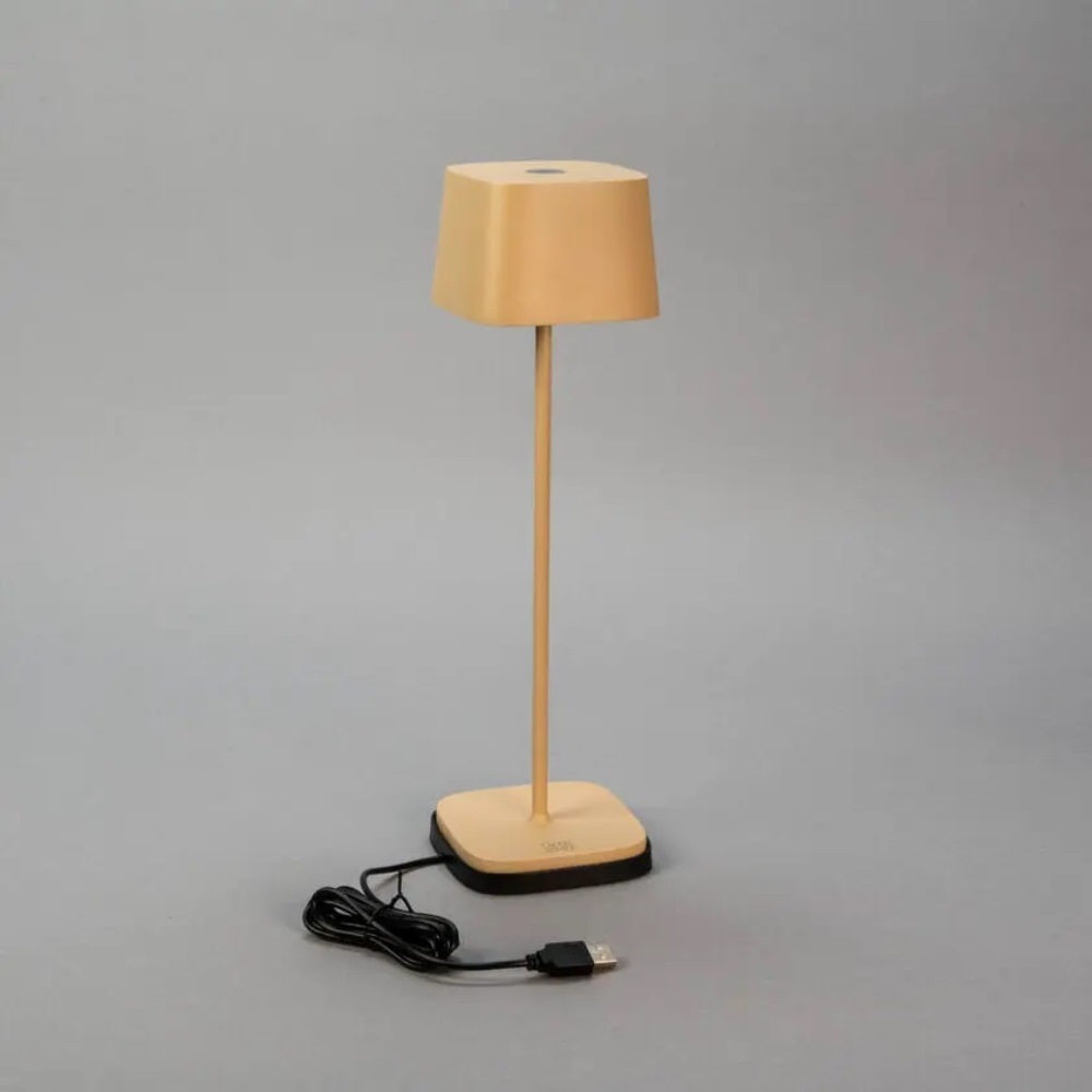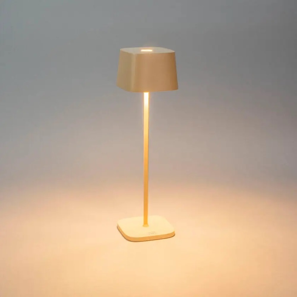 Portabel bordslampa batteri Capri från Konstsmide i sandfärgad lackad aluminium med en stilren design som är uppladdningsbar och dimbar. Det går att välja mellan färgtemperatur på 2700 kelvin eller 3000 kelvin. Loungelampan passar lika bra inne i vardagsrummet som på uteplatsen eller balkongen.