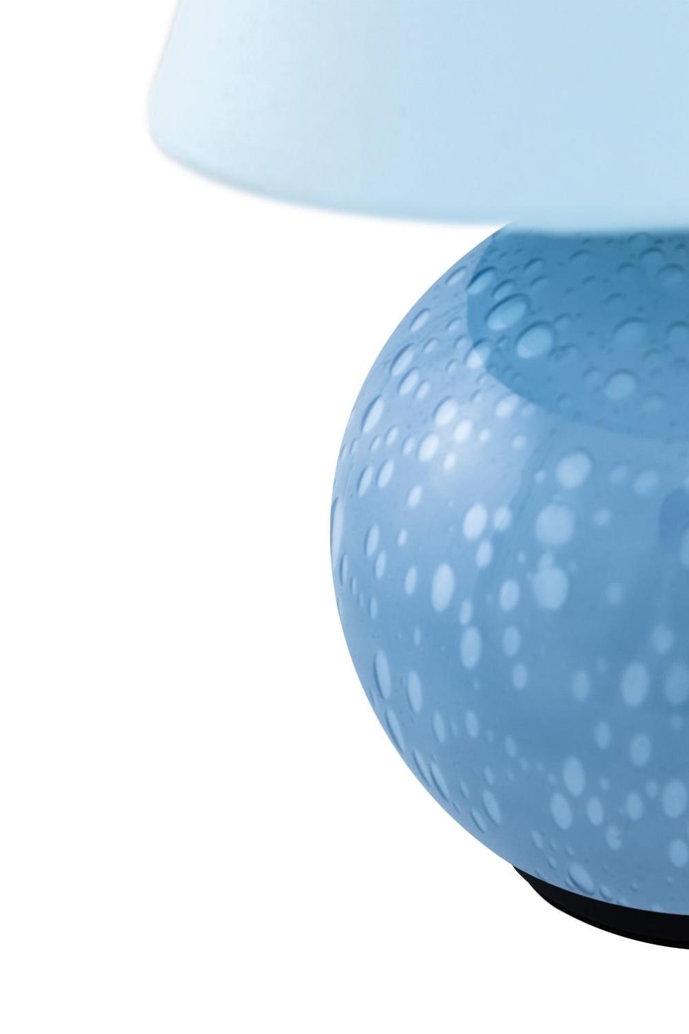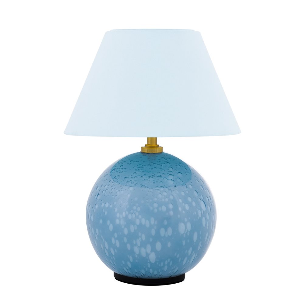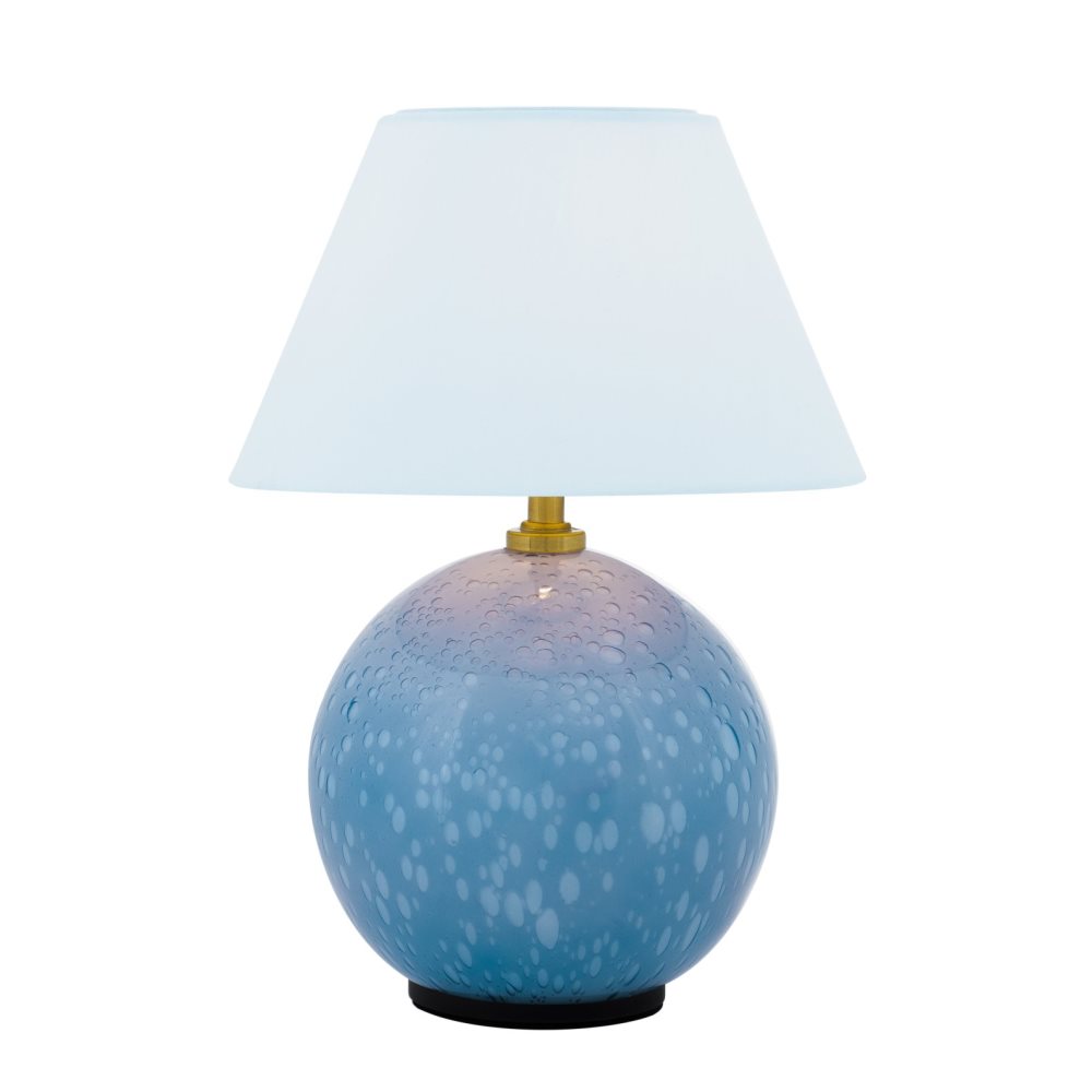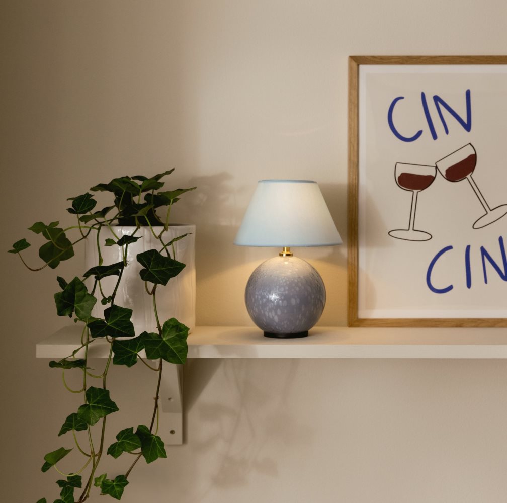 Iris 16 portabel bordslampa från Globen Lighting kombinerar klassisk form med personlig karaktär. Lampan är tillverkad av genomfärgat duvblått glas med unika inblåsta bubblor och har en matchande bomullsskärm som sprider ett mjukt sken. Den sladdlösa designen gör Iris till en flexibel ljuskälla som är enkel att flytta runt i hemmet.
