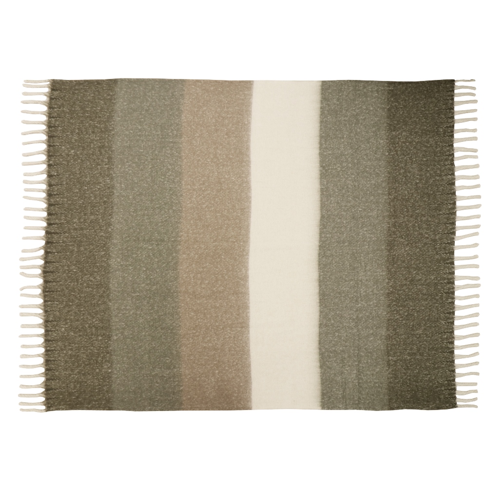 Pläd Quinn från Redlunds är en mjuk och skön pläd i gröna och jordnära nyanser med stora vågräta ränder och dekorativa fransar på kortsidorna. Den tidlösa designen och mjuka kvaliteten gör pläden till en elegant och värmande inredningsdetalj i vardagsrum, sovrum eller läshörna.