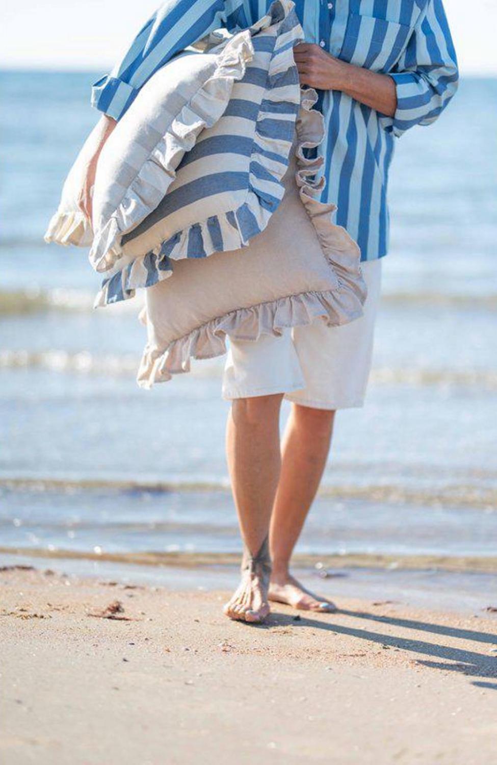 Kuddfodral Amalia från Fondaco är tillverkat i en blandning av återvunnen bomull och polyester. Det har en stilren blockrand i marinblått som varvas med en mjuk, ljus ton, vilket ger ett tidlöst och elegant uttryck. Volangkanten runtom skapar en charmig och dekorativ detalj som lyfter kuddfodralets design. Storlek: 45x45 cm.