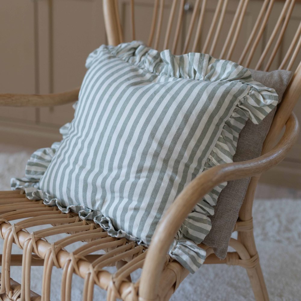Randigt kuddfodral Svea från Fondaco har en tidlös design i lindgrönt och vitt. De dekorativa volangerna ger en charmig karaktär som skapar en trivsam och inbjudande atmosfär i hemmet året om.