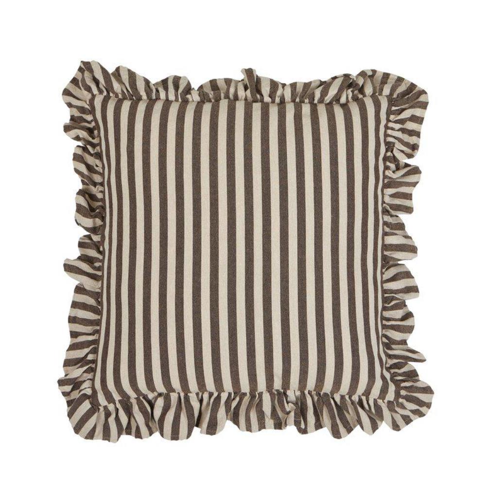 Randigt kuddfodral Svea från Fondaco har en tidlös design i nougatbrunt och vitt. De dekorativa volangerna ger en charmig karaktär som skapar en trivsam och inbjudande atmosfär i hemmet året om.