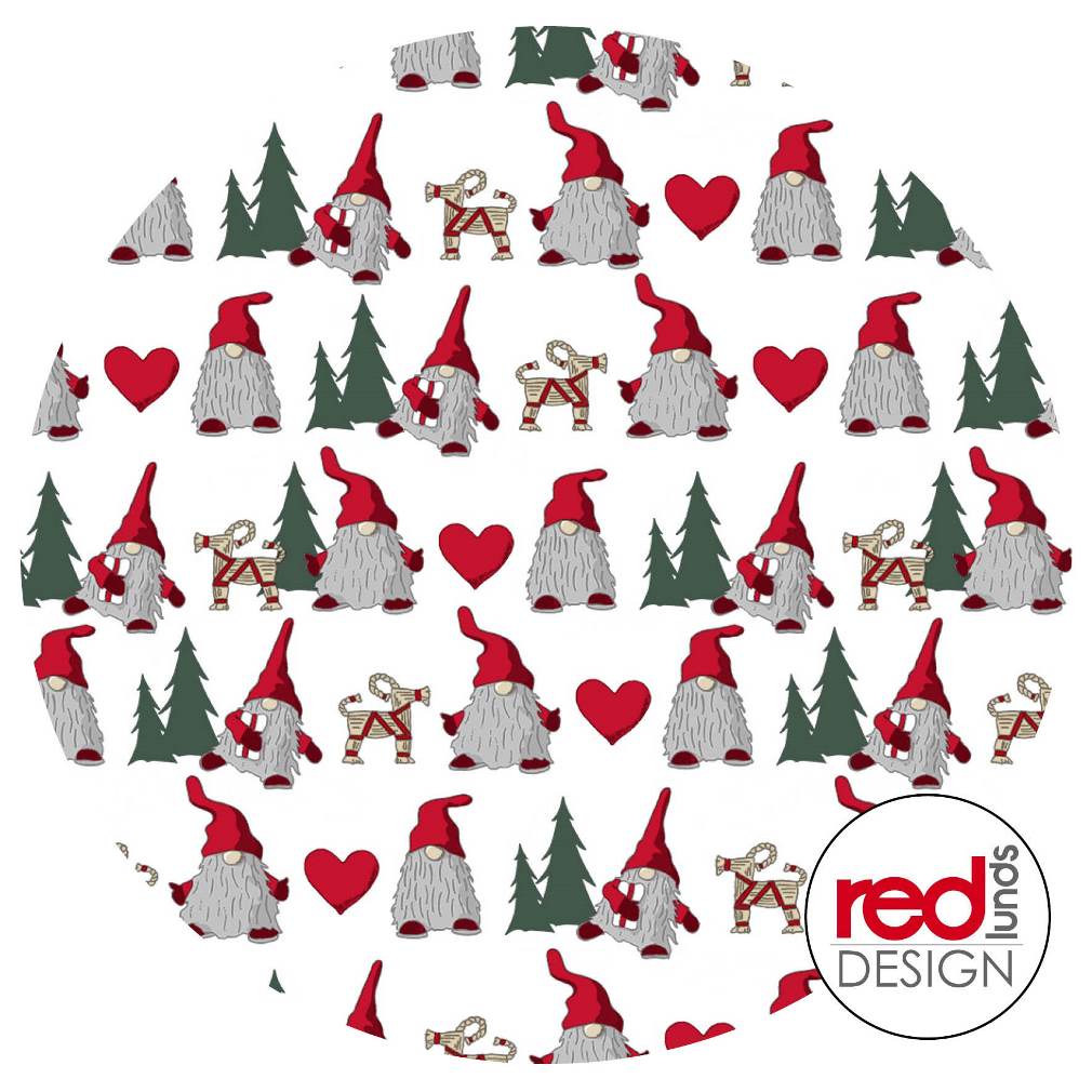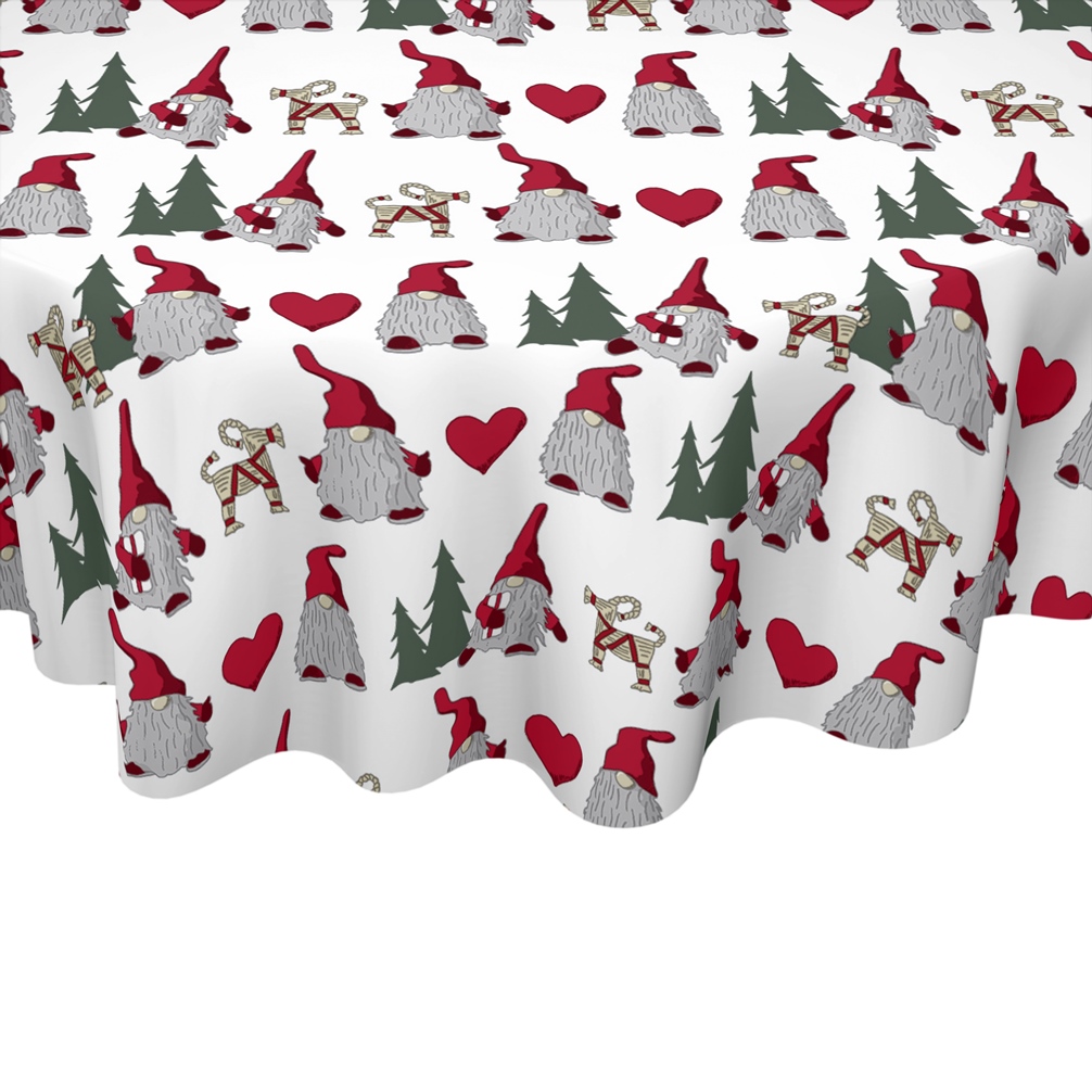 Julvaxduk Noel från Nina Royal med en rund form med rakt skuren kant. Vaxduken har ett vackert mönster av gulliga tomtar med röda tomteluvor, julbockar, gröna julgranar och röda hjärtan på en vit botten. Den är tillverkad av 100% PVC utan ftalater och är både praktisk och hållbar. Den är enkel att torka av och kombinerar stil med funktionalitet. Diametern: 140 cm.