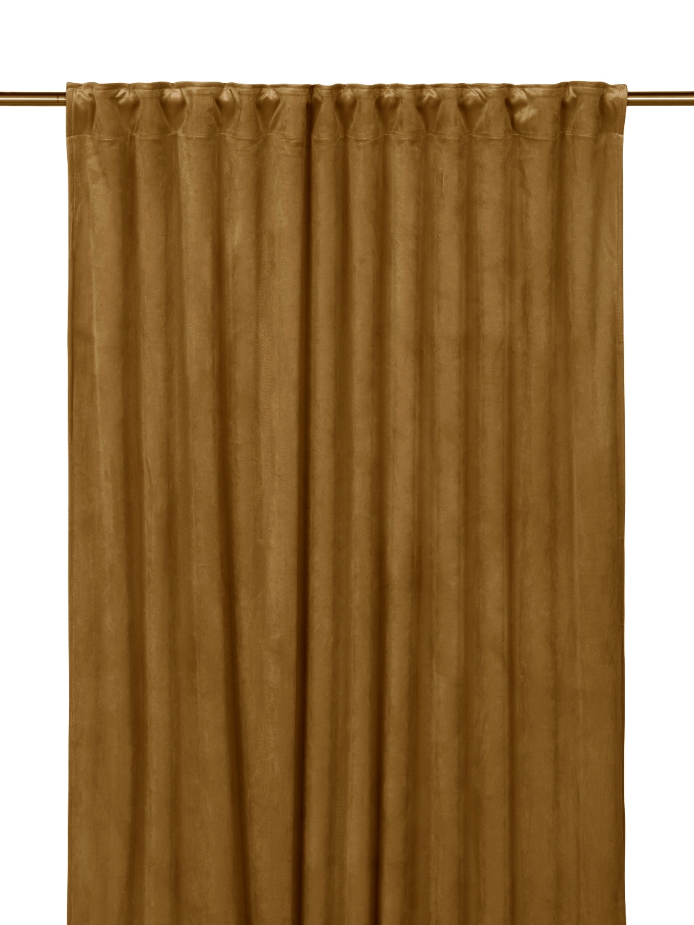 Sammetsgardin Estelle ockra från Svanefors i lyxigaste sammeten med ett elegant fall och en mjukt skimrande yta. Den täta, släta väven ger gardinen en lyxig hotellkänsla och ett elegant uttryck som lyfter hela rummet. Den exklusiva sammeten ger dessutom en viss mörkläggande effekt och är perfekt för dig som vill klä dina fönster i tidlös elegans. Fållade långsidor och overlocksöm i nederkant. Storlek: 135x280 cm.