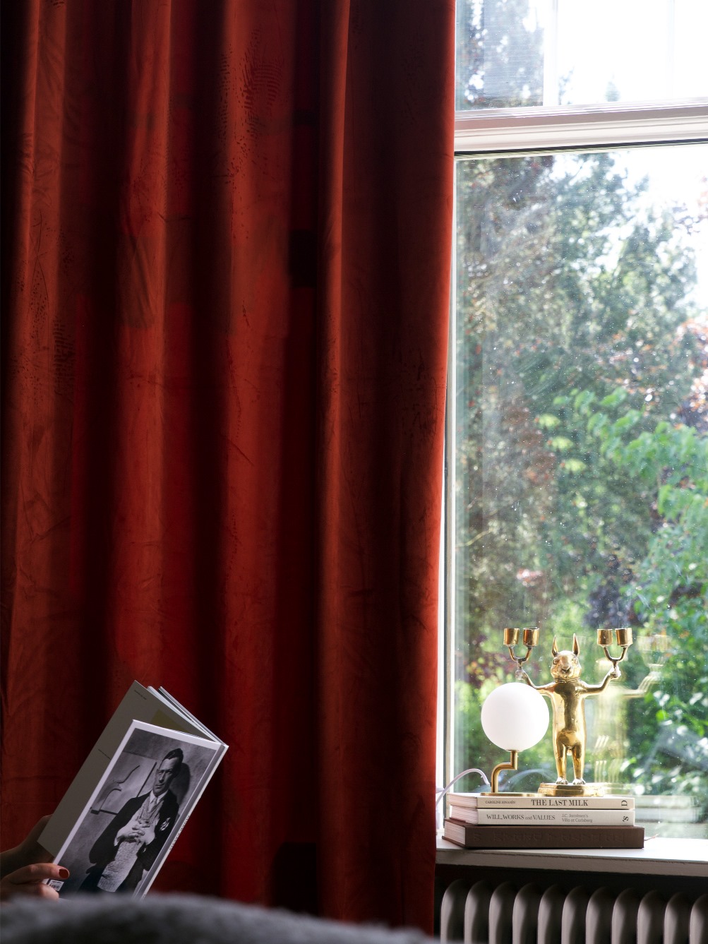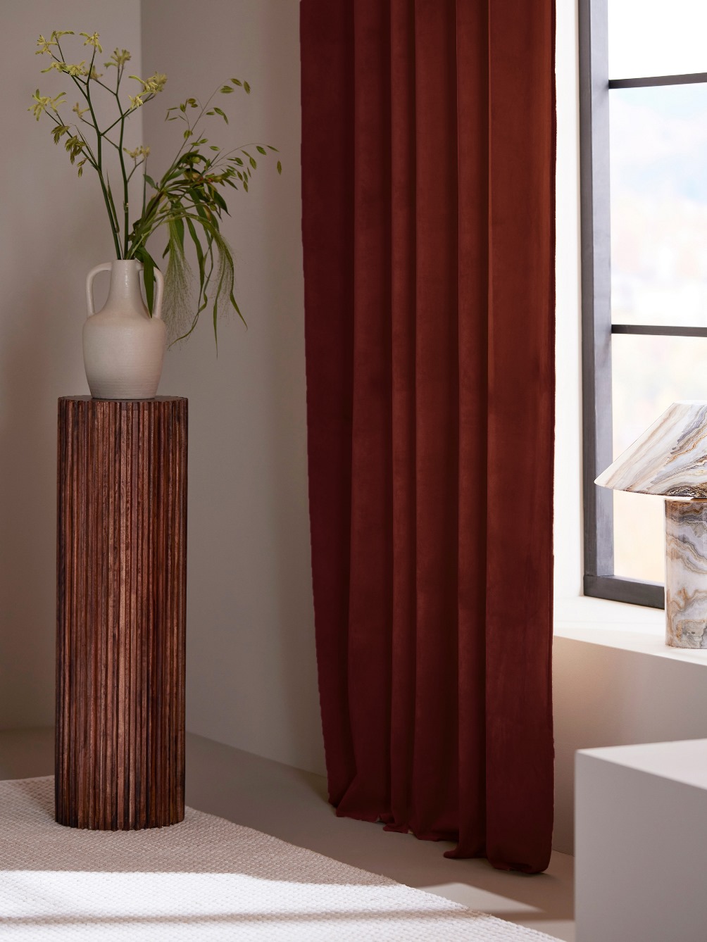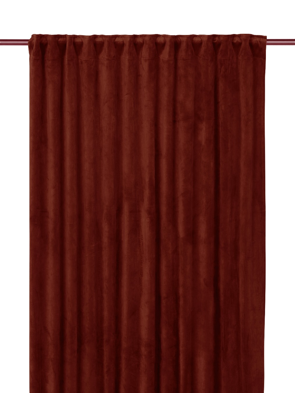 Sammetsgardin Estelle rost från Svanefors i lyxigaste sammeten med ett elegant fall och en mjukt skimrande yta. Den täta, släta väven ger gardinen en lyxig hotellkänsla och ett elegant uttryck som lyfter hela rummet. Den exklusiva sammeten ger dessutom en viss mörkläggande effekt och är perfekt för dig som vill klä dina fönster i tidlös elegans. Fållade långsidor och overlocksöm i nederkant. Storlek: 135x280 cm.