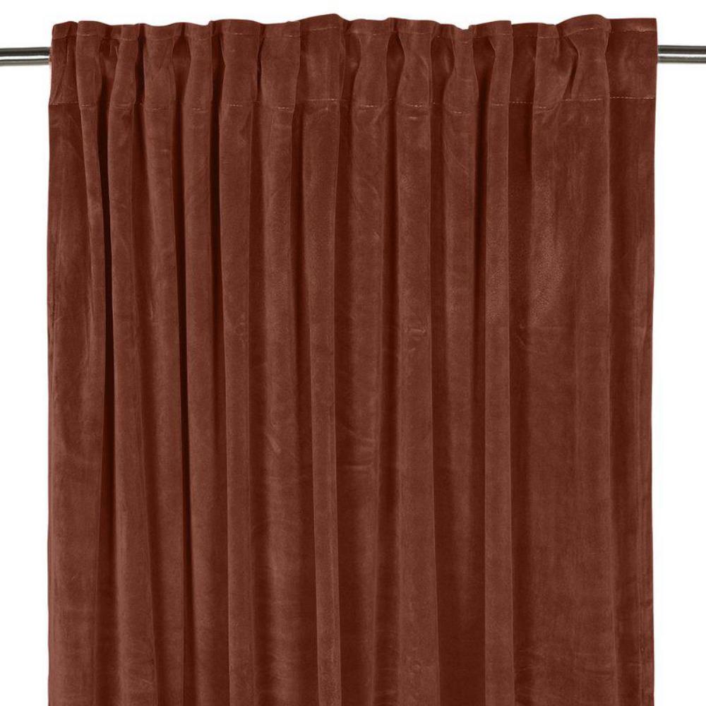 Extra lång sammetsgardin Esther från Fondaco i en vacker rostfärgad nyans. Den lätt glansiga ytan ger ett elegant och ombonat intryck i rummet. Tygets naturliga tyngd skapar ett mjukt och vackert fall, medan sammetens lyster förstärker känslan av både lyx och värme.