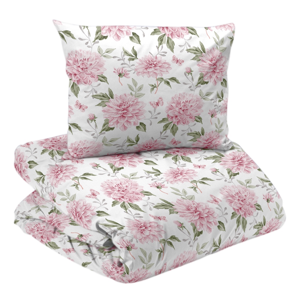 Påslakanset Nadia från Redlunds är tillverkat i mjuk och skön bomullssatin med en trådtäthet på 200 TC, som ger en lyxig känsla. Setet har ett underbart blommönster med dahlior och fjärilar i rosa nyanser mot en ljus botten, vackert kompletterat av gröna blad och stjälkar. En harmonisk design som för in naturens skönhet i sovrummet. Produkten är certifierad enligt OEKO-TEX® STANDARD 100, fri från skadliga ämnen och producerad enligt Amfori för etiska och rättvisa arbetsvillkor.