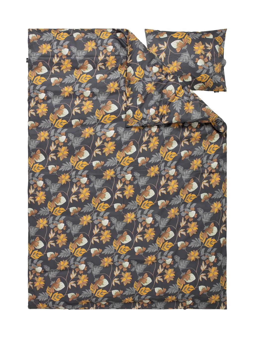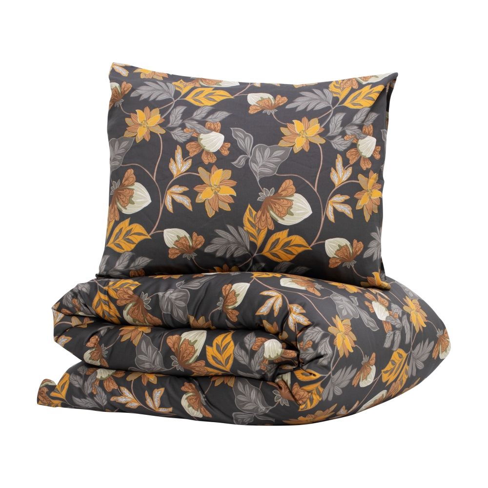 Påslakansetet Bratteby från Kosta Linnewäfveri har ett vackert blommönster i jordnära toner. Blommorna går i mjuka nyanser av ockragult och vitt, medan bladen skimrar i grått och gult mot en elegant grafitgrå botten. Bratteby ger sovrummet en varm och ombonad känsla med sina jordnära färger och eleganta blommönster.