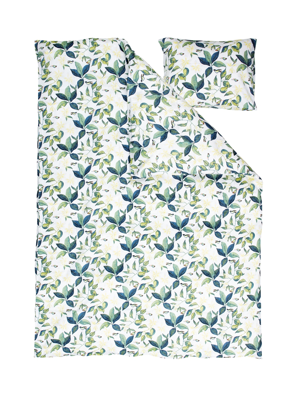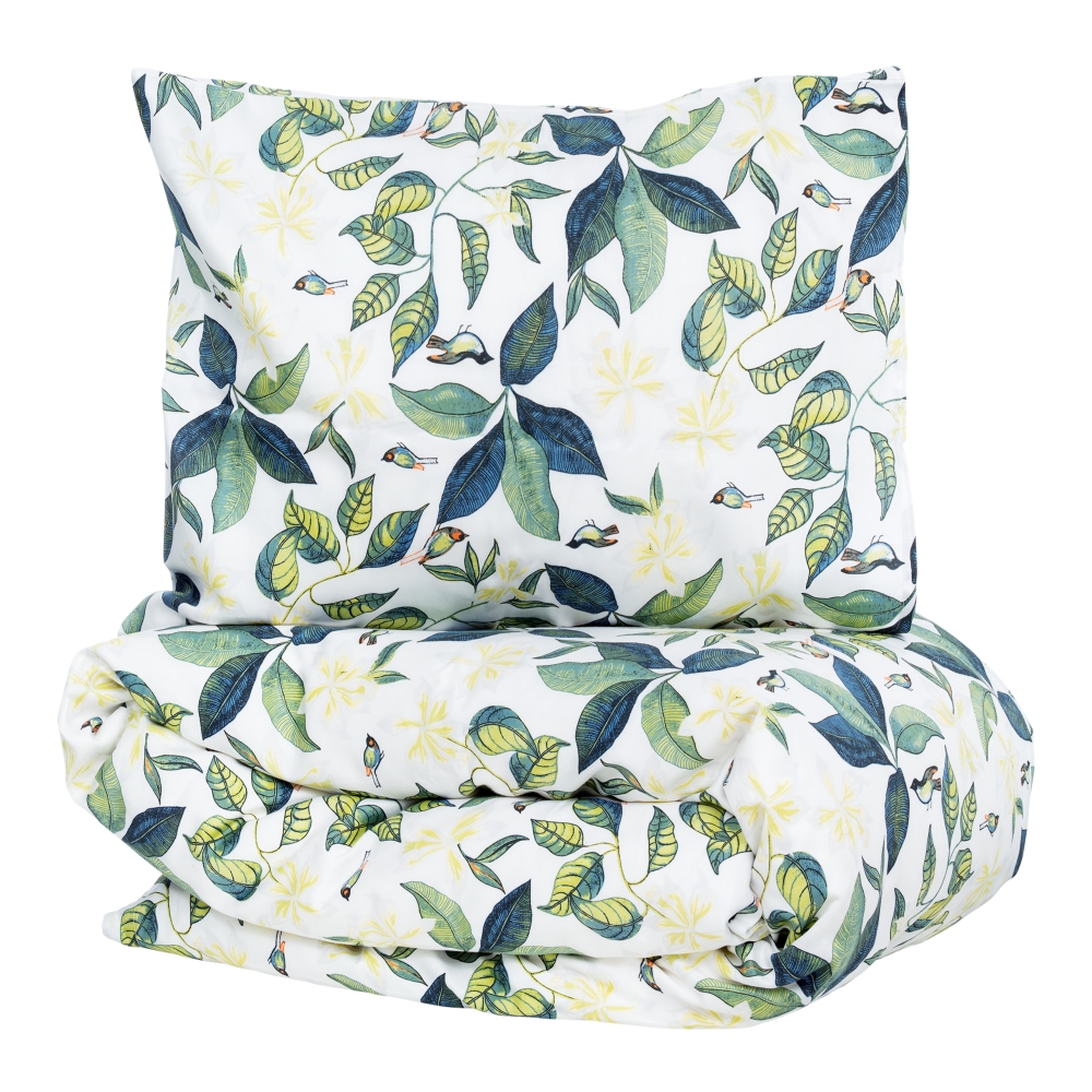 Påslakanset Stale från Kosta Linnewäfveri i vit satinvävd bomull har ett vackert och livfullt mönster med små fåglar och gröna blad. Det detaljrika, naturinspirerade motivet med färgglada accenter skapar en harmonisk och rofylld känsla i sovrummet.