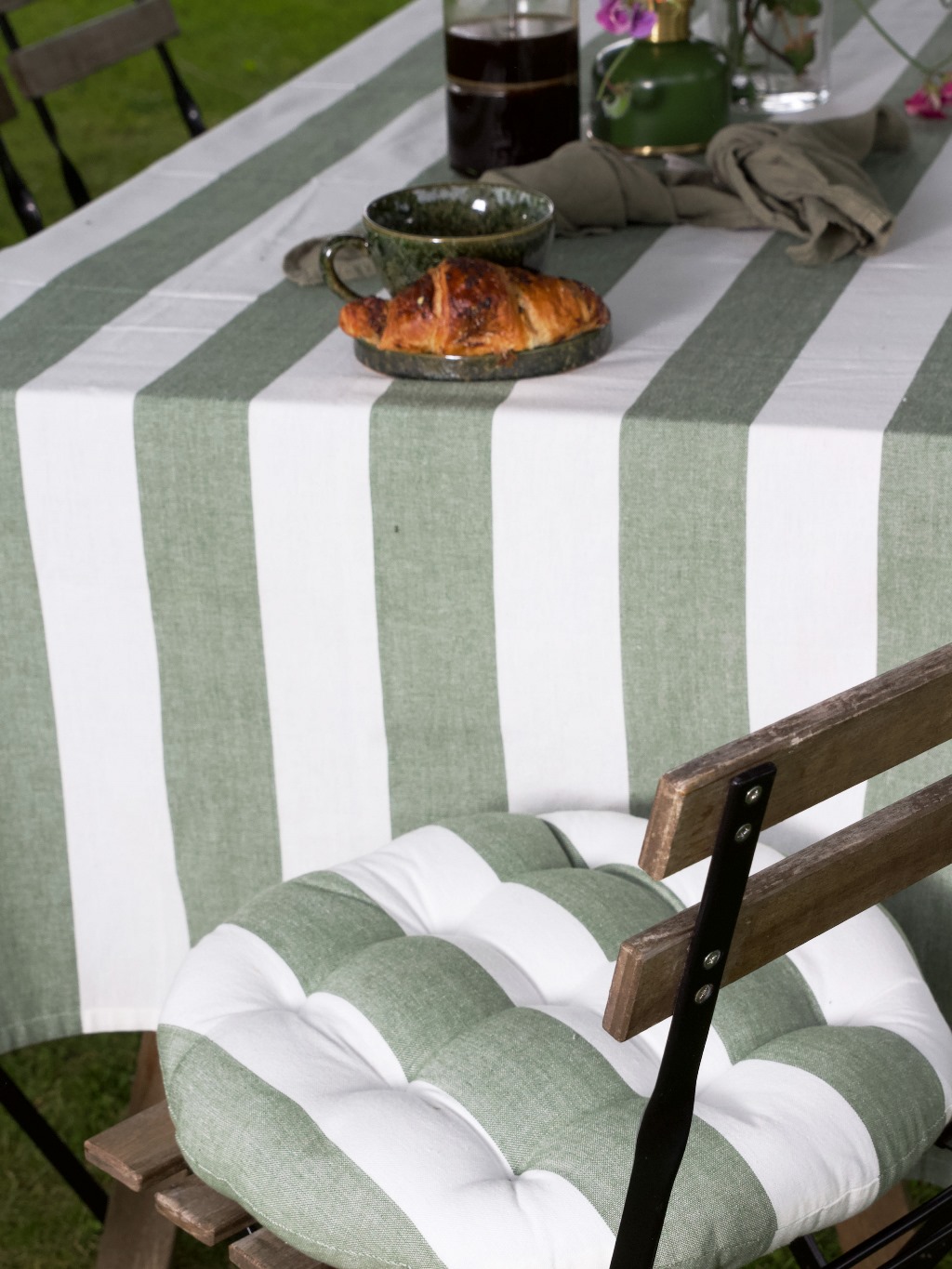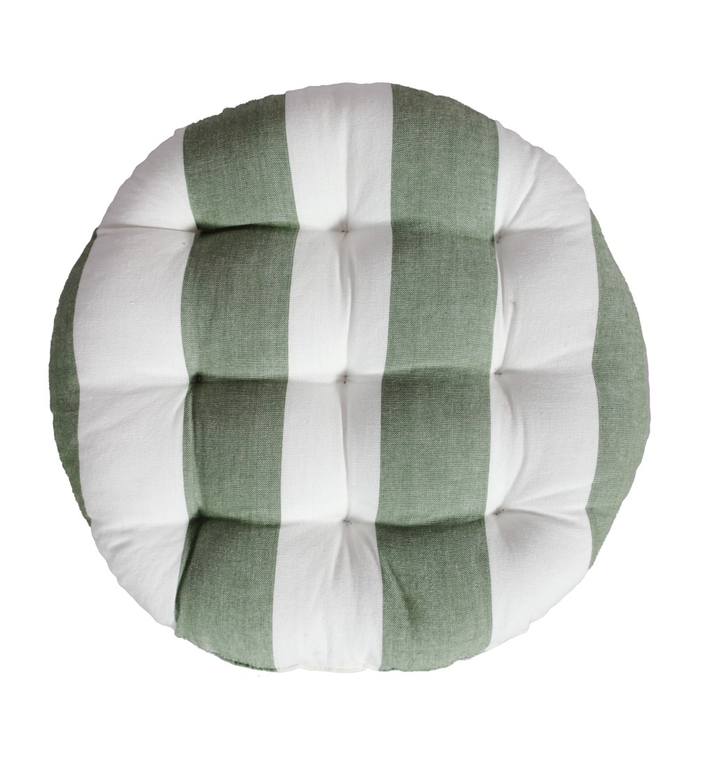 Stolsdyna Louise från Svanefors har fina ränder i mossgrönt och vitt som ger ett somrigt uttryck. Den runda designen i mjuk bomull har dekorativa stygn och en fyllning av polyester för extra komfort. En bekväm stolsdyna som är enkel att matcha med andra textilier och ger stolen en ombonad känsla.