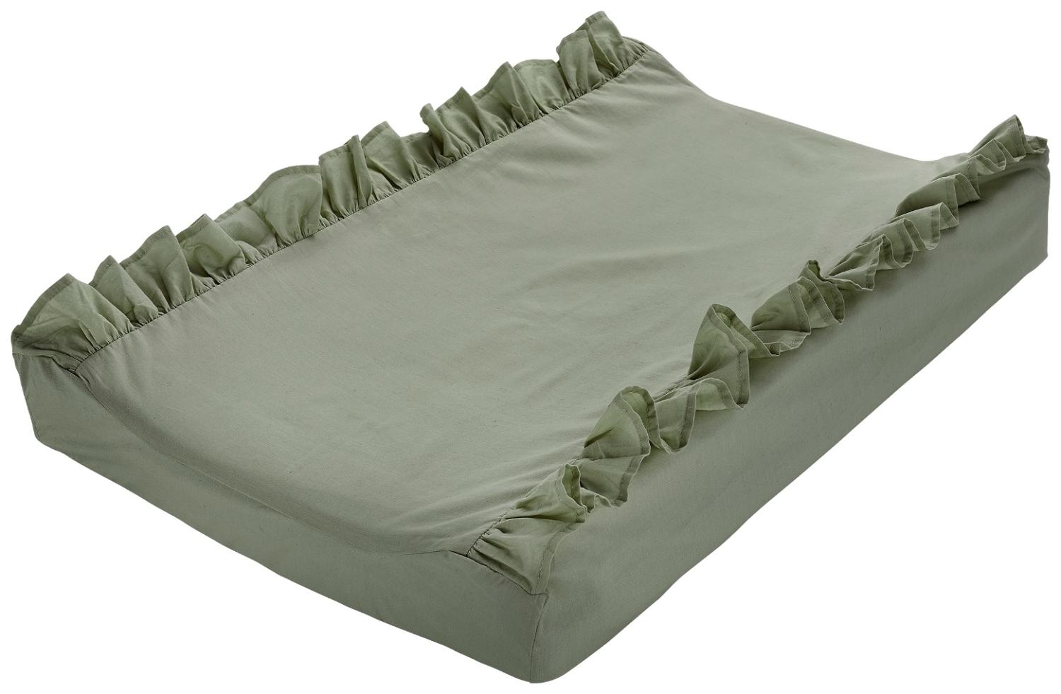 Skötbäddsöverdrag från Borganäs of Sweden med fin design i grön mjuk bomull med söt volang längs långsidorna. Resåren runt om håller tyget på plats och gör det enkelt att fästa på skötbordet som är både praktiskt och dekorativt. Storlek: 50x70 cm.