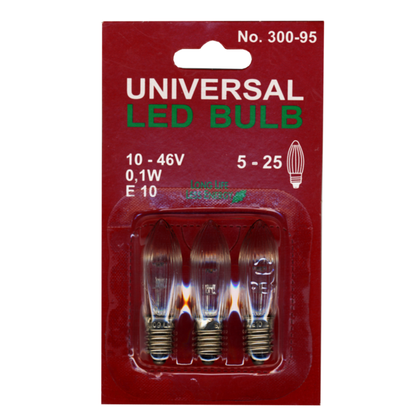 Universal LED Bulb reservlampa i 3-pack med E10 sockel. Lampans ljusflöde är 5 lumen och färgtemperaturen är 2100 kelvin.