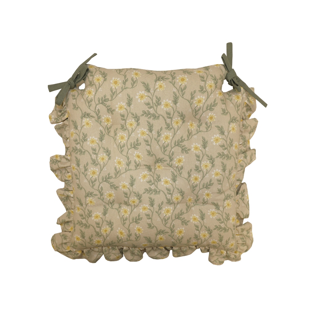 Stolsdyna Fanny från Redlunds med ett vackert blommönster på en beige botten. Dynan har en dekorativ volang runt om och praktiska knytband i hörnen som gör att den sitter stadigt på plats. Perfekt för att ge dina stolar en mjuk, elegant och inbjudande känsla. Storlek: 40x40 cm.