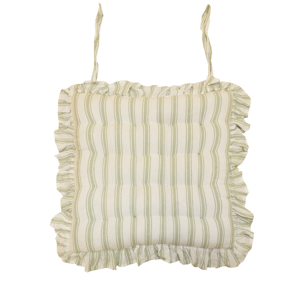 Stolsdyna Madicken från Redlunds har ett elegant randigt mönster i grönt och off-white. Dynan har en dekorativ volangkant runtom som ger en romantisk och charmig stil. Den mjuka stoppningen gör den bekväm att sitta på, och praktiska knytband håller dynan stadigt på plats på stolen. Perfekt för att skapa en ombonad och stilfull känsla vid matbordet. Storlek: 40x40 cm.