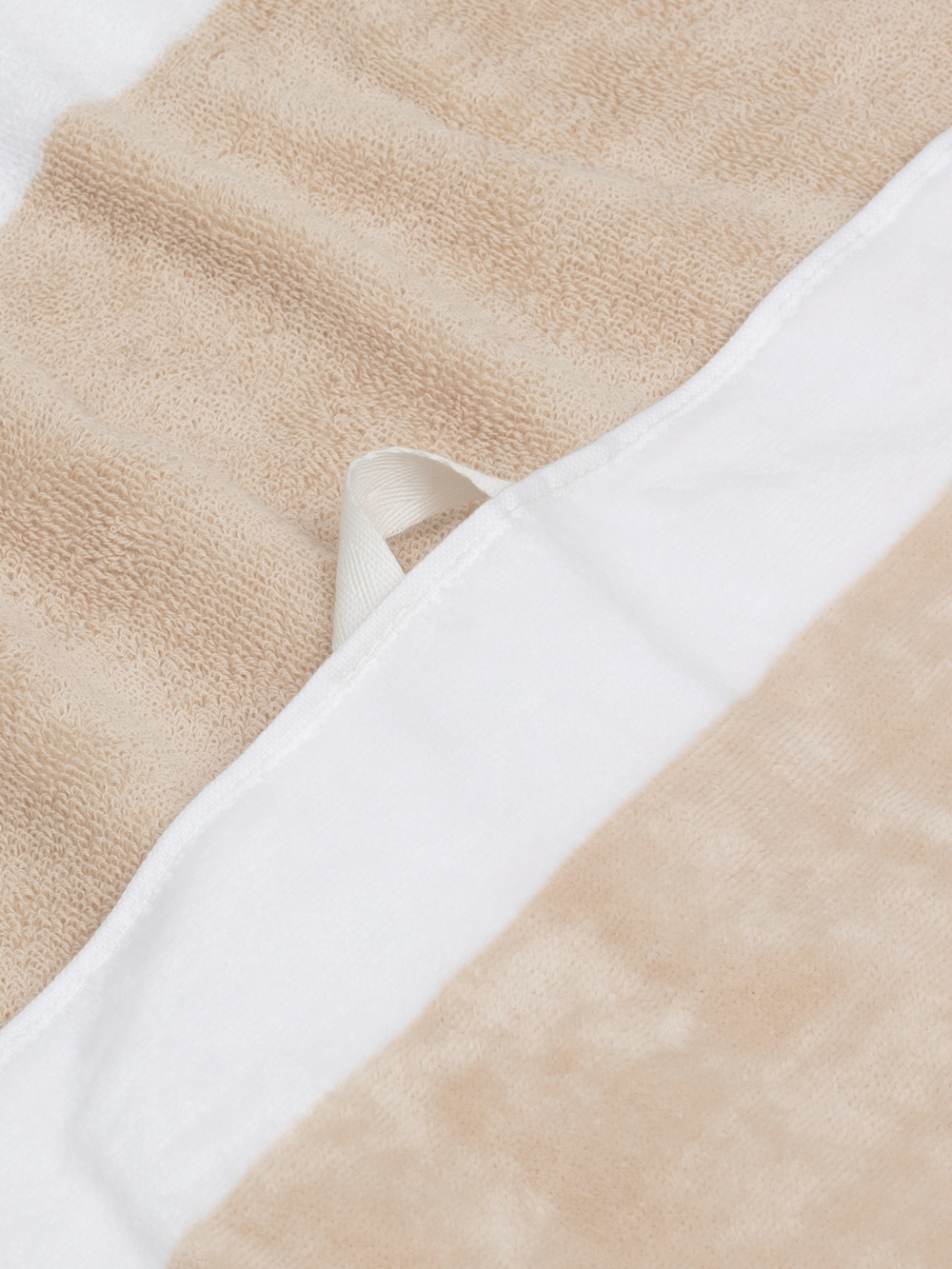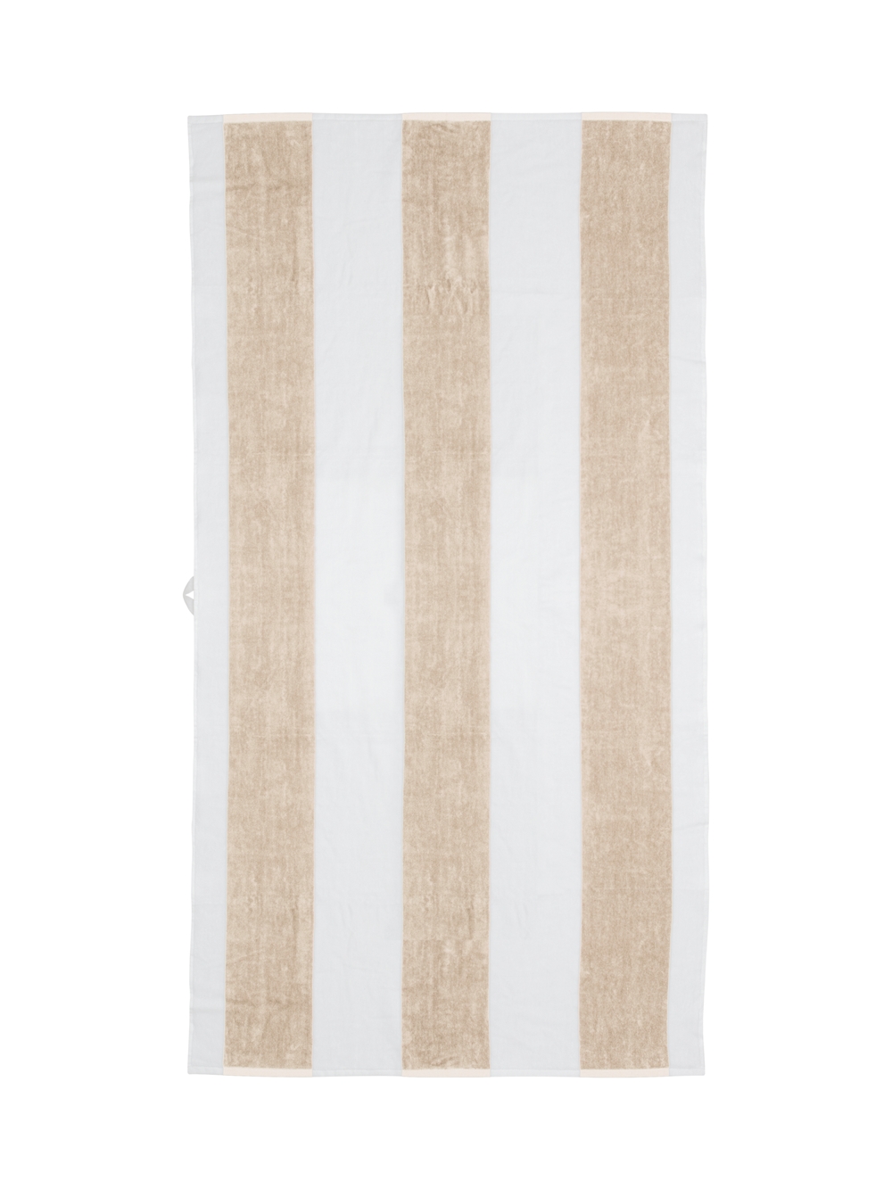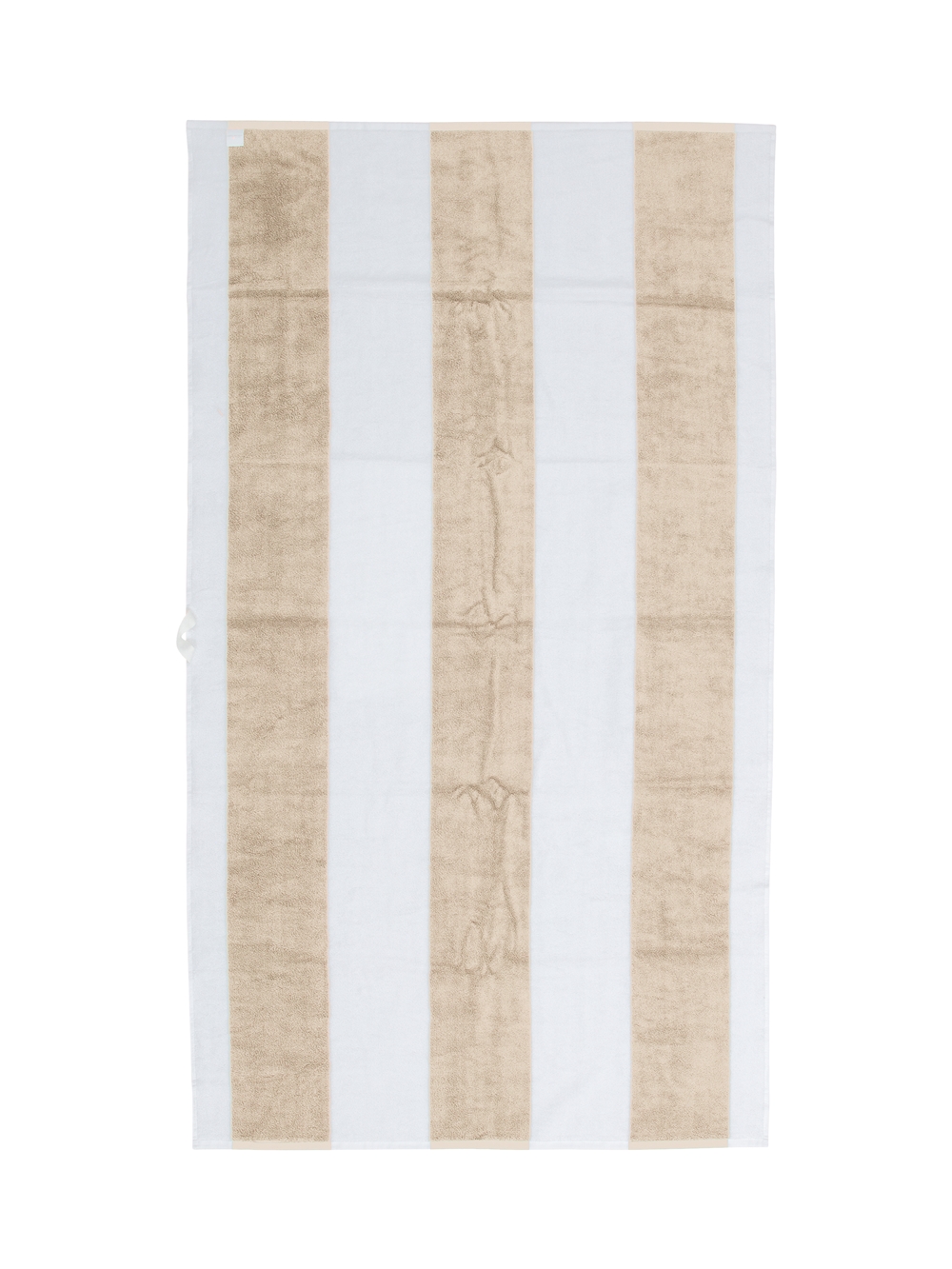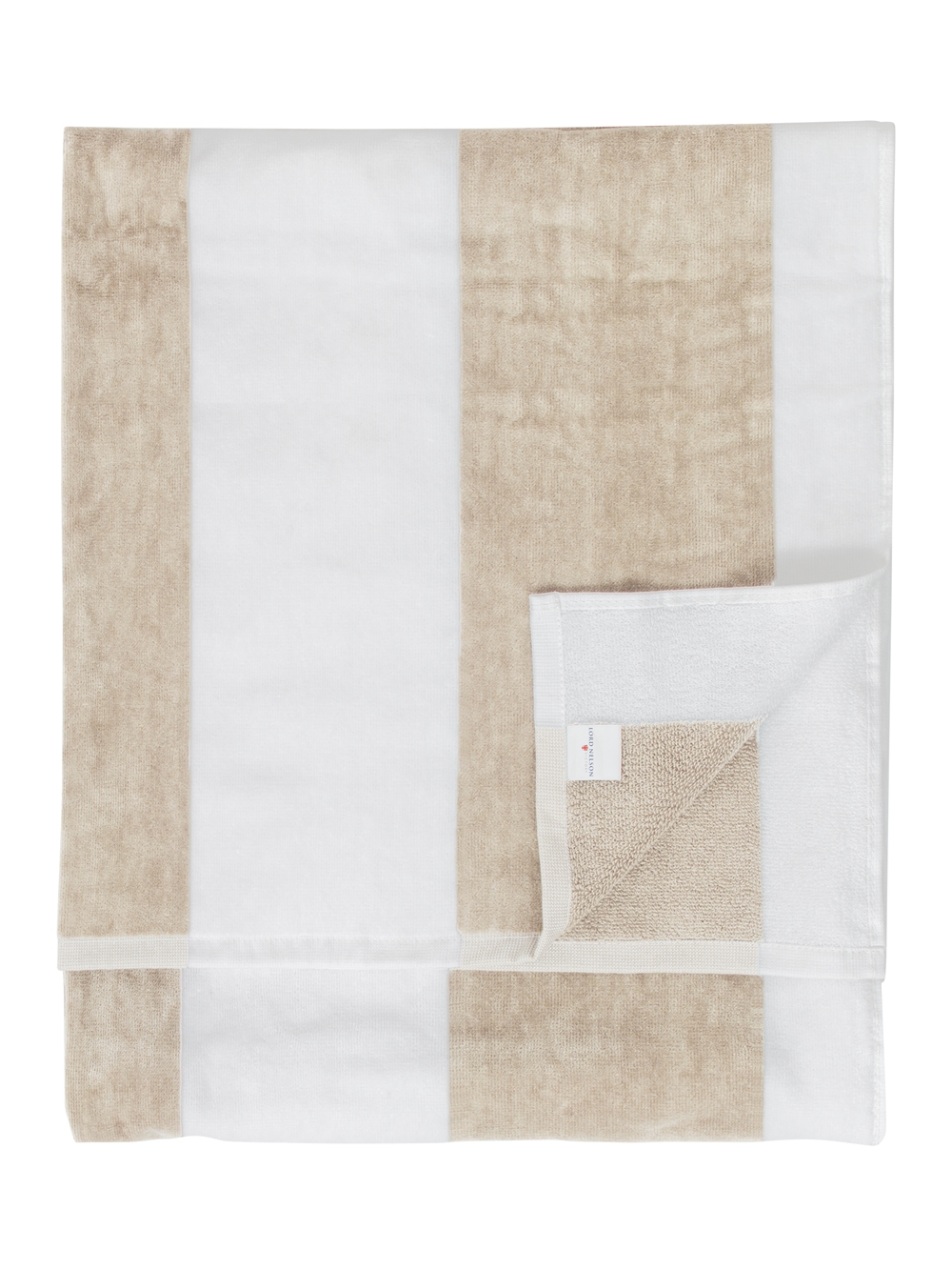 Strandhandduk Rand från Lord Nelson Victory i kraftig bomullsfrotté med ett tidlöst, marininspirerat mönster i breda vertikala ränder. Den sandbeige nyansen varvas med krämvitt och skapar en stilren och somrig känsla för bryggan, stranden eller poolen. Storlek: 80x160 cm.