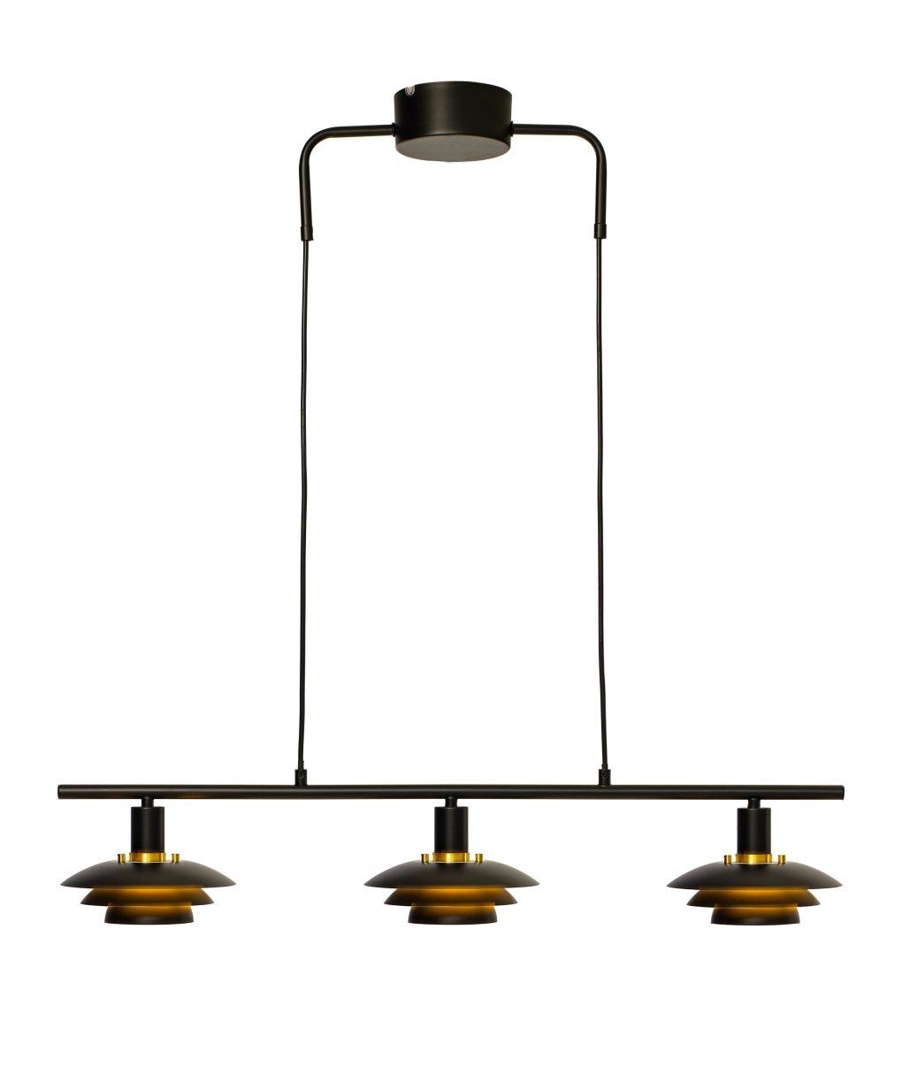 Taklampa Epsilon från Aneta Lighting är tillverkad i svart metall och har en klassisk design med tre mindre skärmar som ger ett modernt intryck. Lampan sprider ett behagligt ljus och passar utmärkt att hänga över matbordet eller köksön.