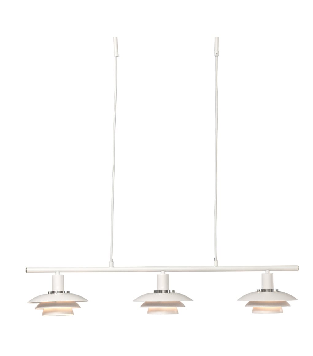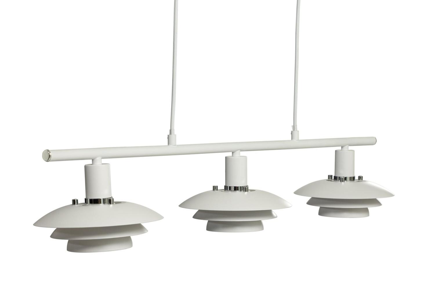 Taklampa Epsilon från Aneta Lighting är tillverkad i vit metall och har en klassisk design med tre mindre skärmar som ger ett modernt intryck. Lampan sprider ett behagligt ljus och passar utmärkt att hänga över matbordet eller köksön.