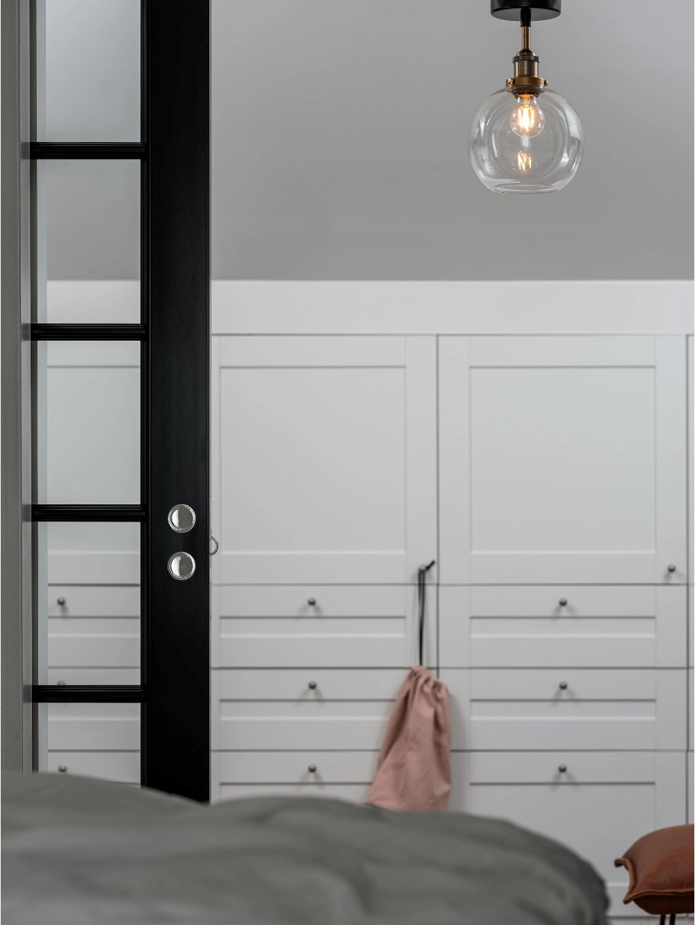 Taklampa Omega från PR Home har en klassisk design med krok för upphängning, klarglas och ett metallchassi i matt svart eller mässingsfinish. Den handgjorda glasskärmen ger varje lampa ett unikt uttryck, med små luftbubblor och naturliga variationer i tjocklek som bidrar till charmen och hantverkskänslan. Till Omega rekommenderas en ljuskälla med en E27 sockel, max 40W. Ljuskälla ingår ej.