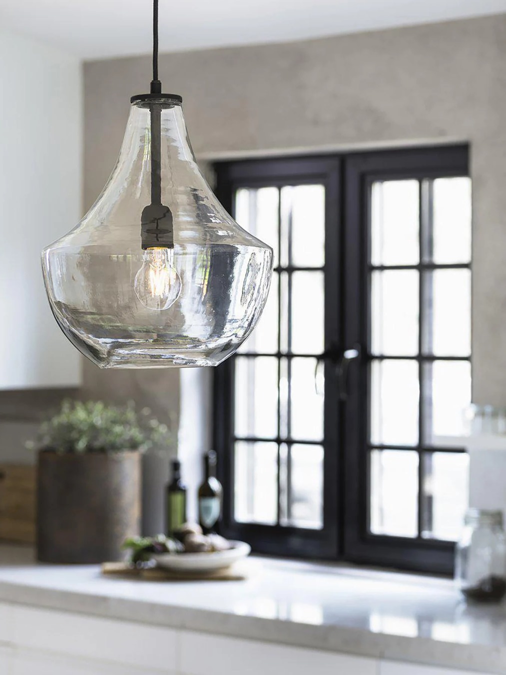 Taklampa Hamilton från PR Home har en klassisk och modern design som passar perfekt i både kök, vardagsrum och hall. Den är tillverkad för hand i klart glas med svarta metalldetaljer som skapar en vacker kontrast. Det handblåsta glaset kan ha små bubblor och skiftningar, som ger varje lampa ett unikt uttryck och bidrar till en levande ljusbild. Höjd 38 cm och diametern 30 cm. Den levereras med en cirka 1,5 meter svart textilkabel med takkopp i metall för krokupphäng. Till Hamilton rekommenderas en ljuskälla med en E27 sockel, max 40W. Ljuskälla ingår ej.