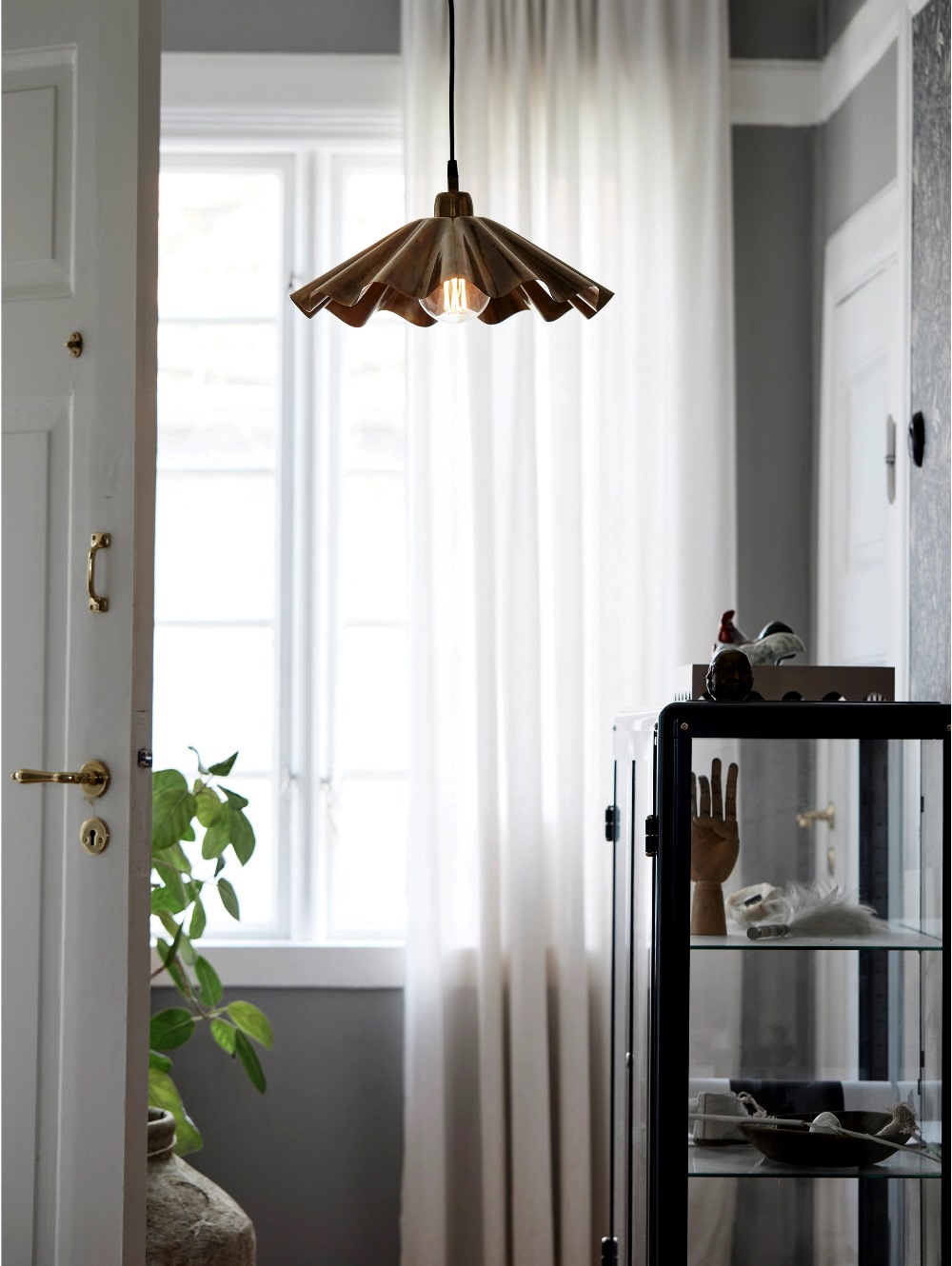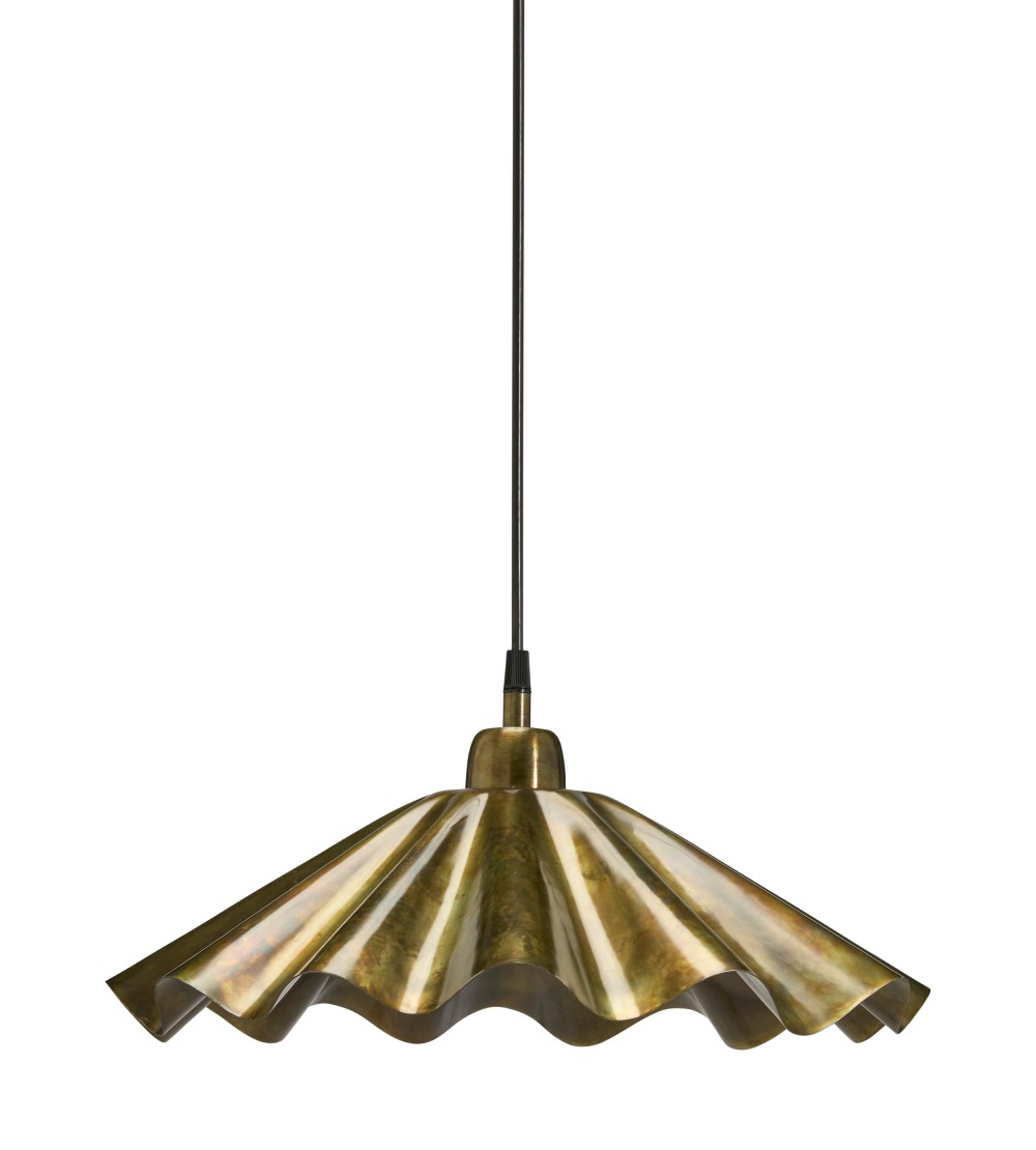 Taklampa Aira från PR Home har en dekorativ, veckad skärm i metall med handgjord bränd mässingsfinish, varje lampa är unik. Den rustika ytan kombineras med en modern form och den sprider ett varmt, inbjudande sken. Fin över matbordet eller soffbordet. Höjd 18 cm och bredd och djup 41 cm. Den levereras med en 1,6 meter svart plastsladd med takkopp för krokupphäng. Till Aira rekommenderas en ljuskälla med en E27 sockel, max 25W. Ljuskälla ingår ej.