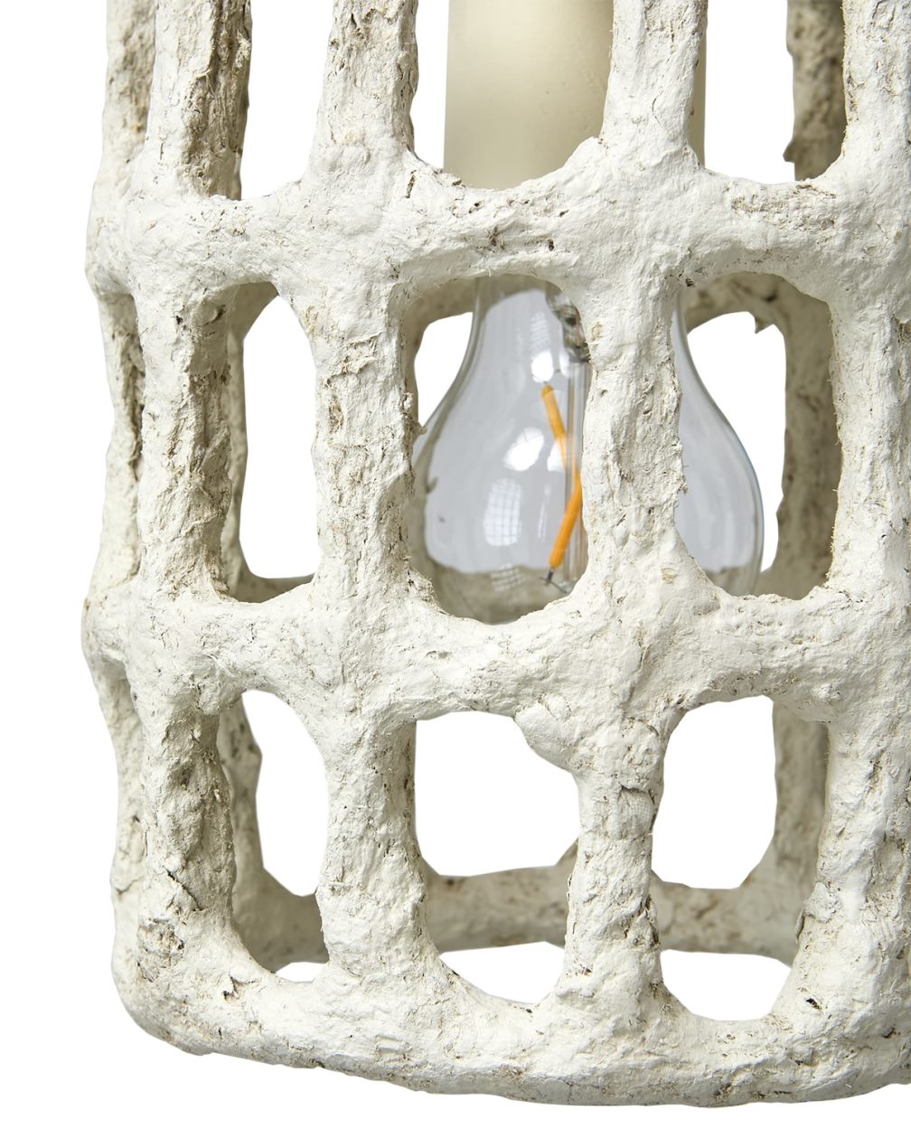Taklampa Ruta från Affari of Sweden med en bohemisk och naturnära design. Den är tillverkad i naturfärgat papier-maché, ett lätt och hållbart material som ger den en rustik, handgjord känsla. Skärmens design har utskurna hål som låter ljuskällan vara synlig, som skapar ett dekorativt ljusspel. Tack vare sin nätta storlek passar taklampan lika bra i ett fönster, över ett mindre bord eller i hallen, som en dekorativ detalj i hemmet. Höjd: 19 cm. Diameter: 17 cm. Den levereras med en 1,5 meter sladd med EU stickkontakt. Till Rut rekommenderas en ljuskälla med en E27 sockel, max 25W. Ljuskälla ingår ej.