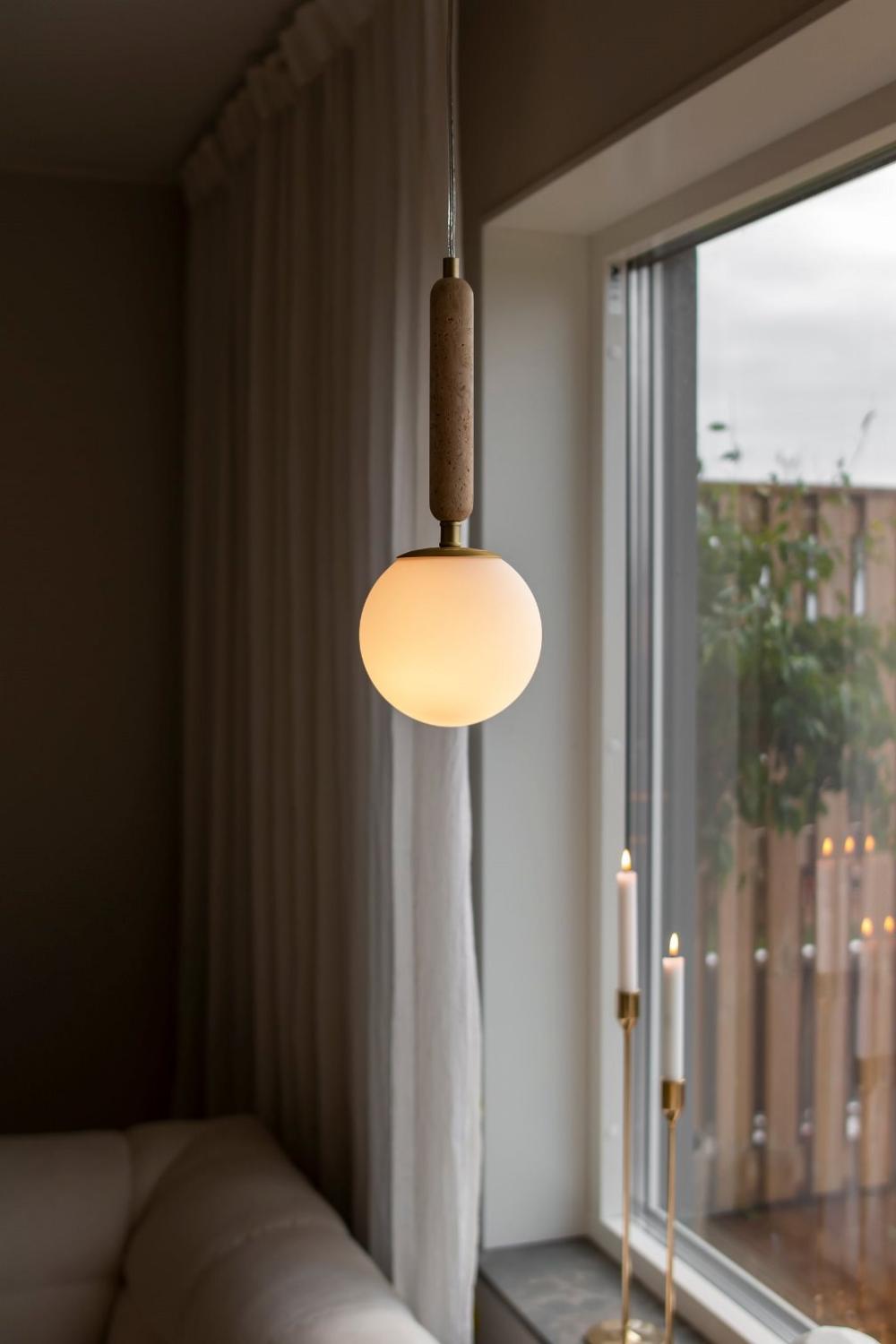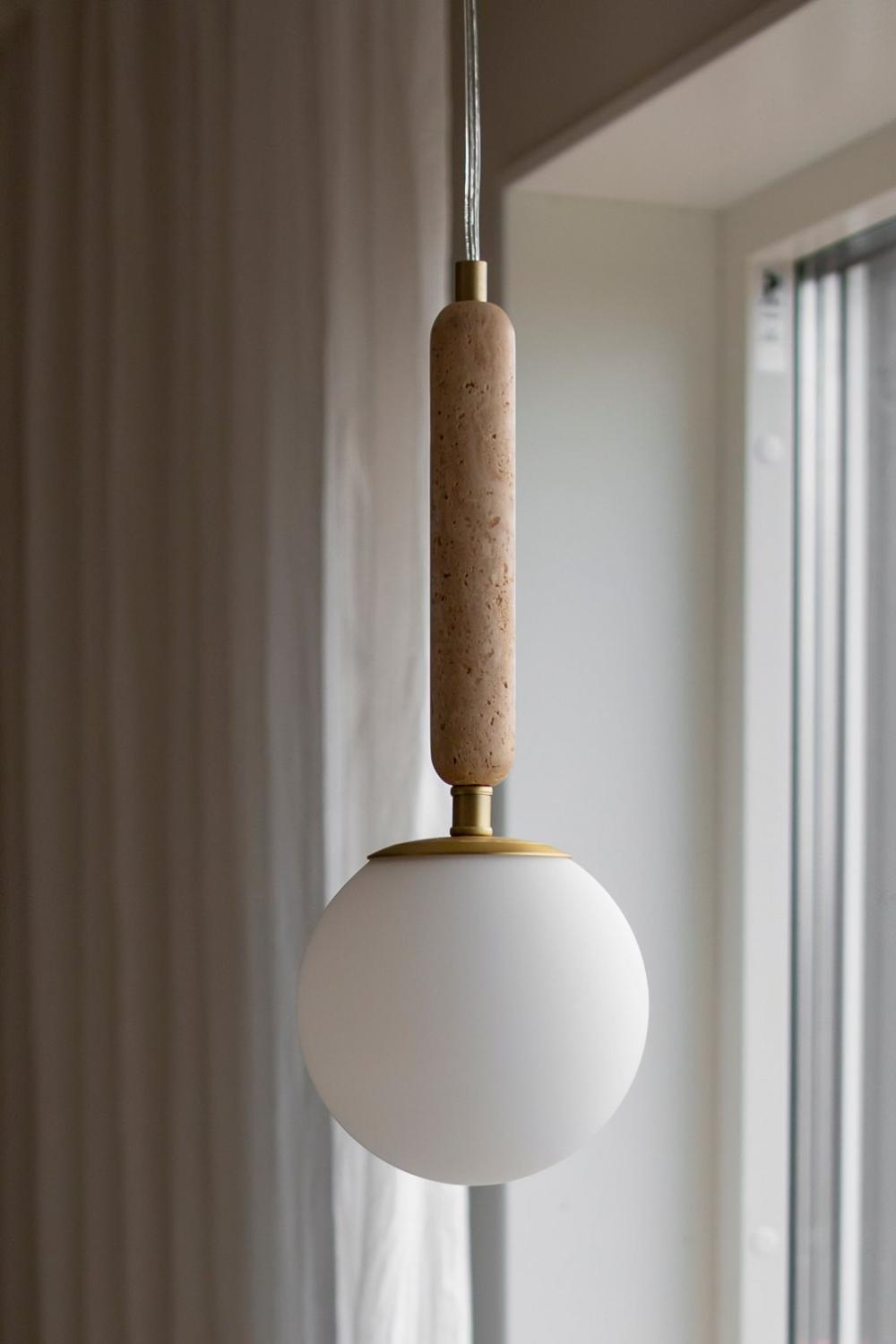 Pendeln har en mattvit glaskupa som sprider ett mjukt och behagligt ljus, och de borstade mässingsfärgade metalldetaljerna ger en modern och stilren finish som kompletterar marmorn. Perfekt för vardagsrum, matplats eller kontor som vill ha både funktion och design i fokus.