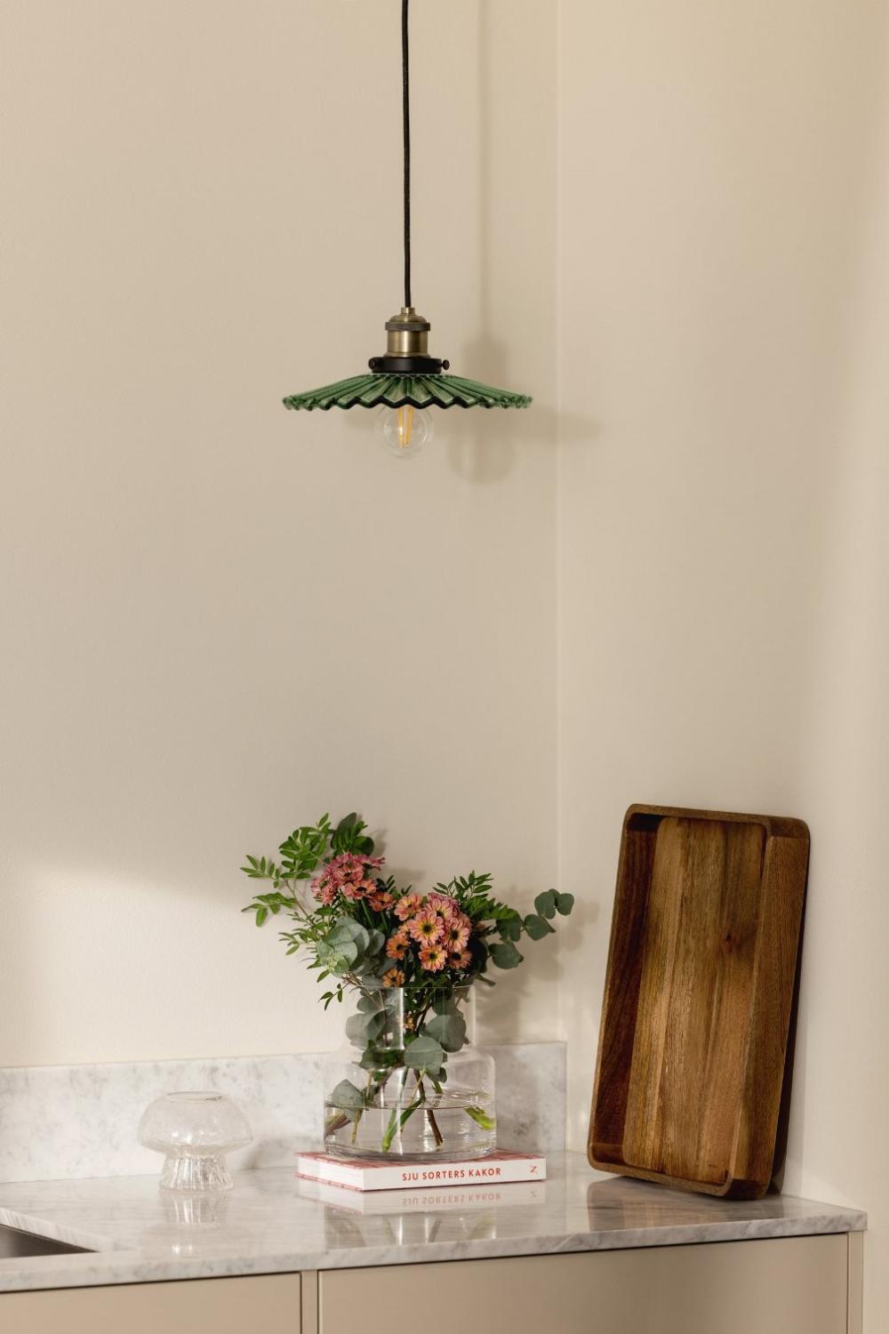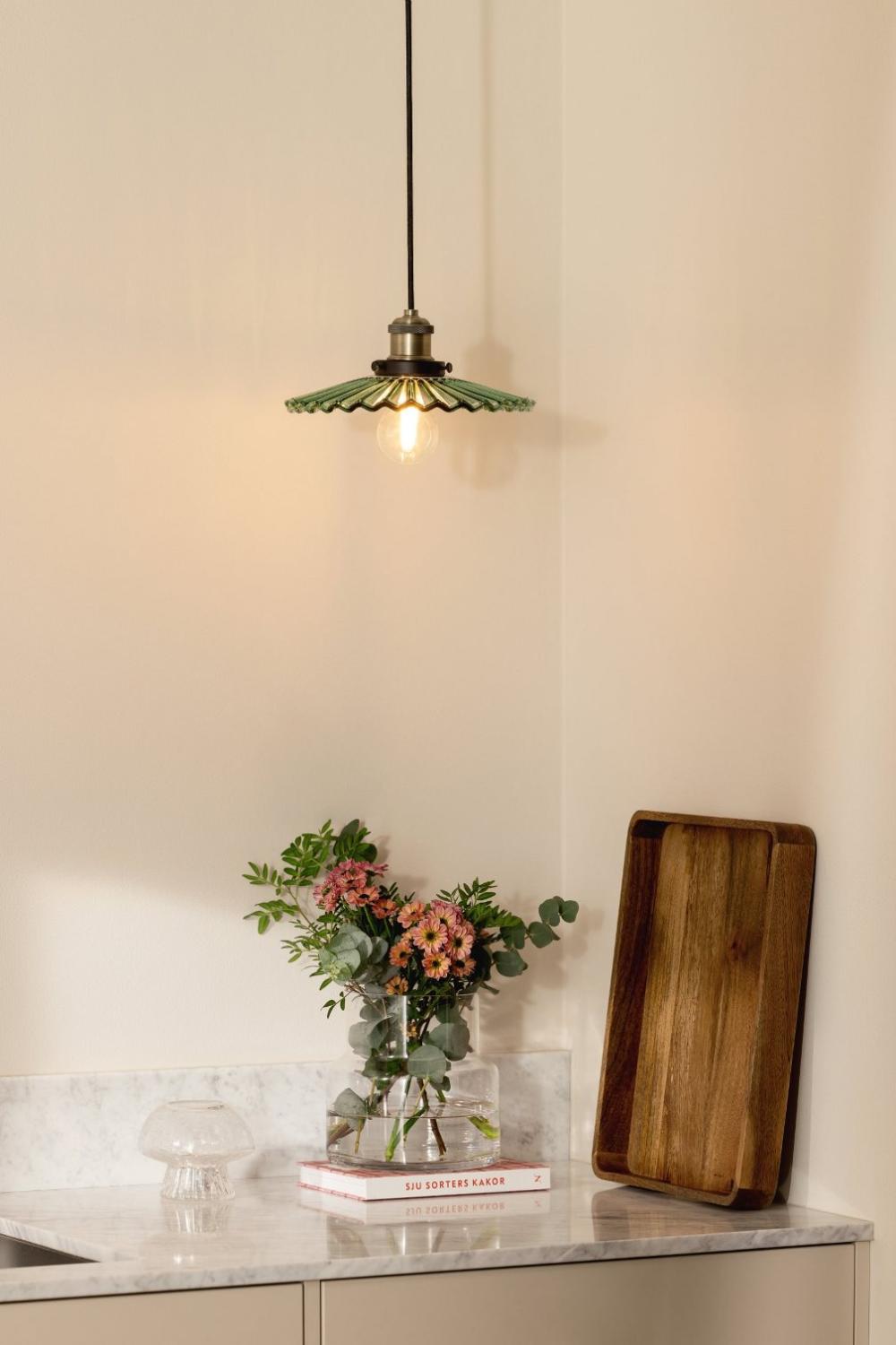 Taklampa Mini Cobbler från Globen Lighting är en vacker tolkning av den klassiska skomakarlampan. Den har en elegant glaskupa i veckat grönt glas som sprider ett varmt och stämningsfullt ljus. Den eleganta kombinationen av mattsvart och antikmässing skapar en tidlös och charmig karaktär som passar perfekt i både moderna och sekelskiftesinspirerade hem.