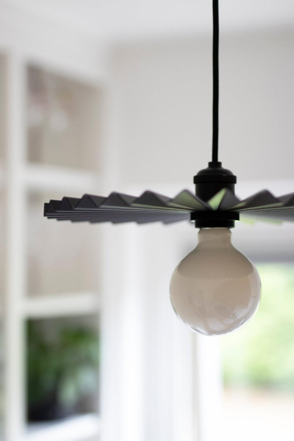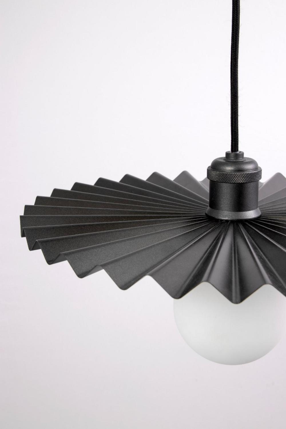 Taklampa Omega från varumärket Globen Lighting har en veckad metallskärm i mattsvart som blir en iögonfallande och stilren detalj i rummet. Taklampan är lika vacker ensam som i grupp och skapar en modern, dekorativ atmosfär. Omega levereras med en 1,2 meter svart textilkabel och svart plasttakkopp för enkel installation. Ljuskälla ingår ej.