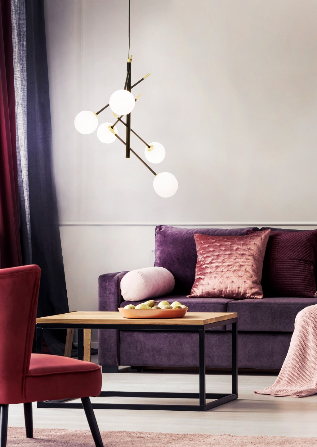 Taklampa Acrobat från Aneta Lighting och har en modern och trendig design. Den är är tillverkad i svartlackerad metall med fina detaljer i matt mässing med fem opalvita glaskupor. Taklampan ger ett behagligt ljus och blir ett fint inslag i hemmet. Till Acrobat rekommenderas en ljuskälla med en G9 sockel, max 5x25W. Levereras med takkopp i metall för krokupphäng. Höjden är 75 cm och längd och bredden är 58 cm. Ljuskällor ingår ej.