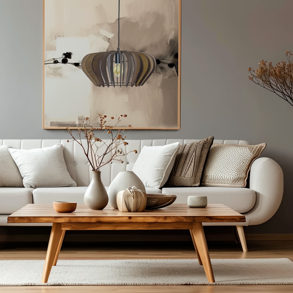 Taklampa Calyps från Aneta Lighting har en elegant och tidlös design med brunbetsade plywoodlameller i mjukt rundad form. Lamellerna skapar en vacker ljus- och skuggeffekt som sprider allmänljus jämnt i rummet. Den dekorativa taklampan är perfekt över köksbordet, i vardagsrummet eller på andra platser där du vill kombinera stilren design med funktionell belysning. Rekommenderad ljuskälla: E27, max 10W. Ljuskälla ingår ej.