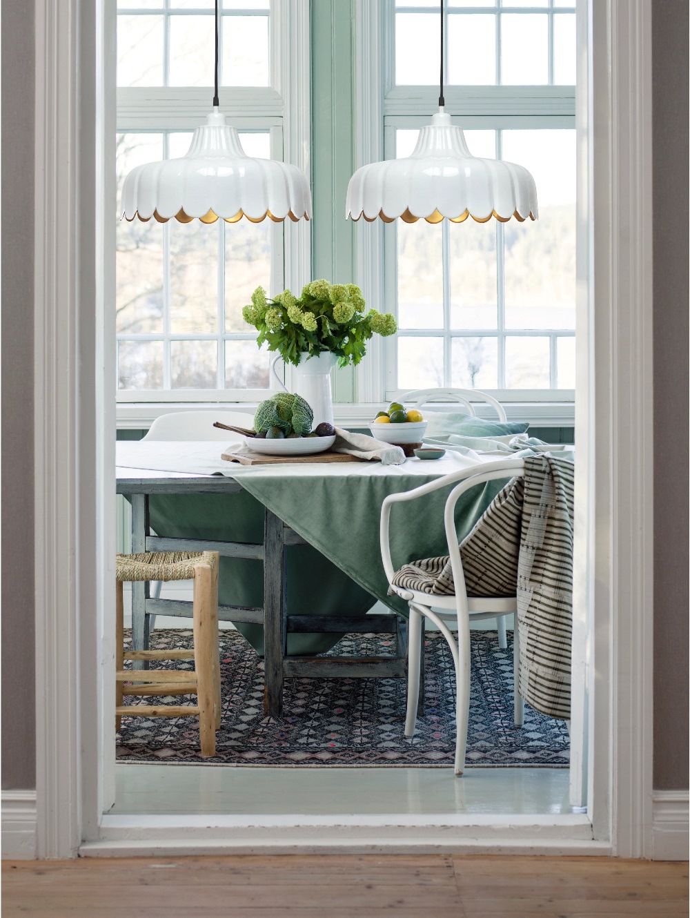 Taklampa Wells från PR Home har en handgjord design med charmiga detaljer i vit metall och en varm guldfärgad insida. Den vackra formen är hämtat från en blomma och har en romantisk och härlig design. Höjd 29 cm och bredd och djup 45 cm. Wells levereras med en 1,6 meter svart plastsladd med vit takkopp för krokupphäng. Till taklampan rekommenderas en ljuskälla med E27 sockel, max 25W. Ljuskälla ingår ej.