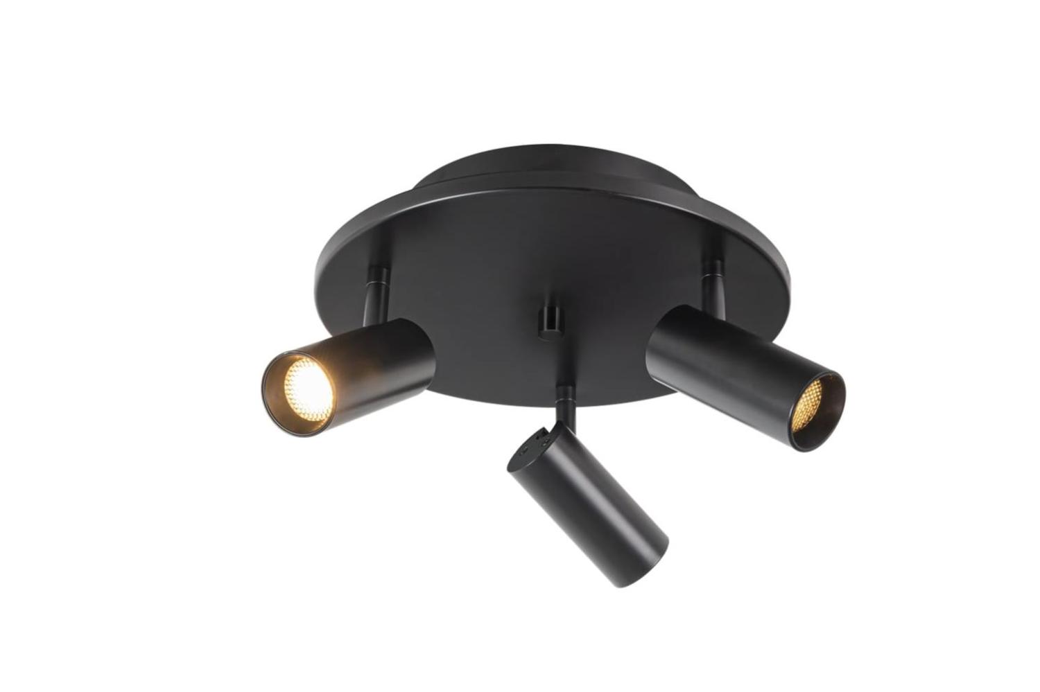 Takspotlight Concord från Aneta Lighting har en rund design i mattlackerad svart metall som passar perfekt i de flesta hem. Den har tre justerbara lamphuvuden med utbytbara LED-ljuskällor och inbyggda bländskyddsraster, som ger ett behagligt, riktat ljus utan att blända. Lampan avger ett varmvitt sken och är dimbar för att kunna anpassas efter stämning och behov. Bländskyddsrastrena kan tas bort om du vill ha ännu mer ljus. LED-ljuskällor med en maxeffekt på 3x7W ingår.
