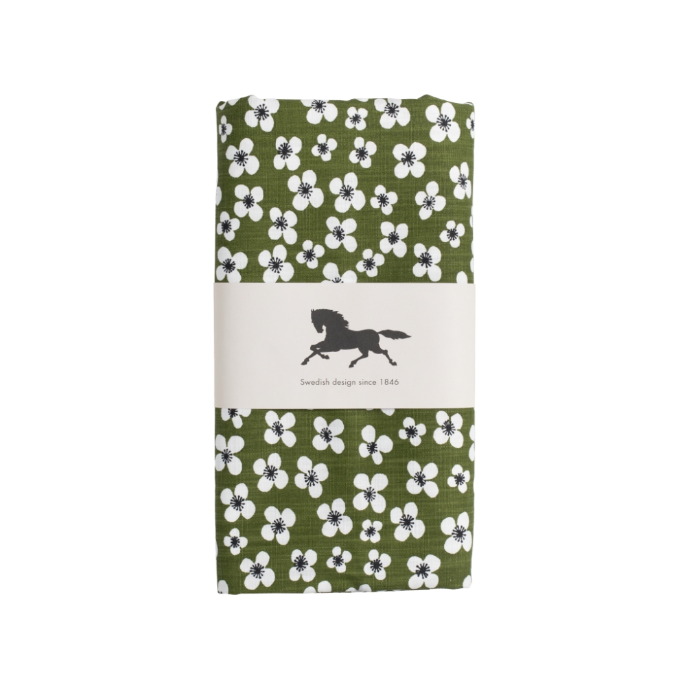 Textilvaxduk Belle Amie, 145x220 cm, från Almedahls har ett vackert mönster med vita blommor mot en mörkgrön botten. Blomstertrycket bygger på Marianne Westmans klassiska originaldesign Körsbärsträdgården, där körsbärsblommorna står i fokus. Tillverkad i bomull med akrylatbeläggning, vilket gör duken tålig, avtorkningsbar och enkel att använda i vardagen. Perfekt för köksbord, altan eller som skydd vid pyssel och måltider.