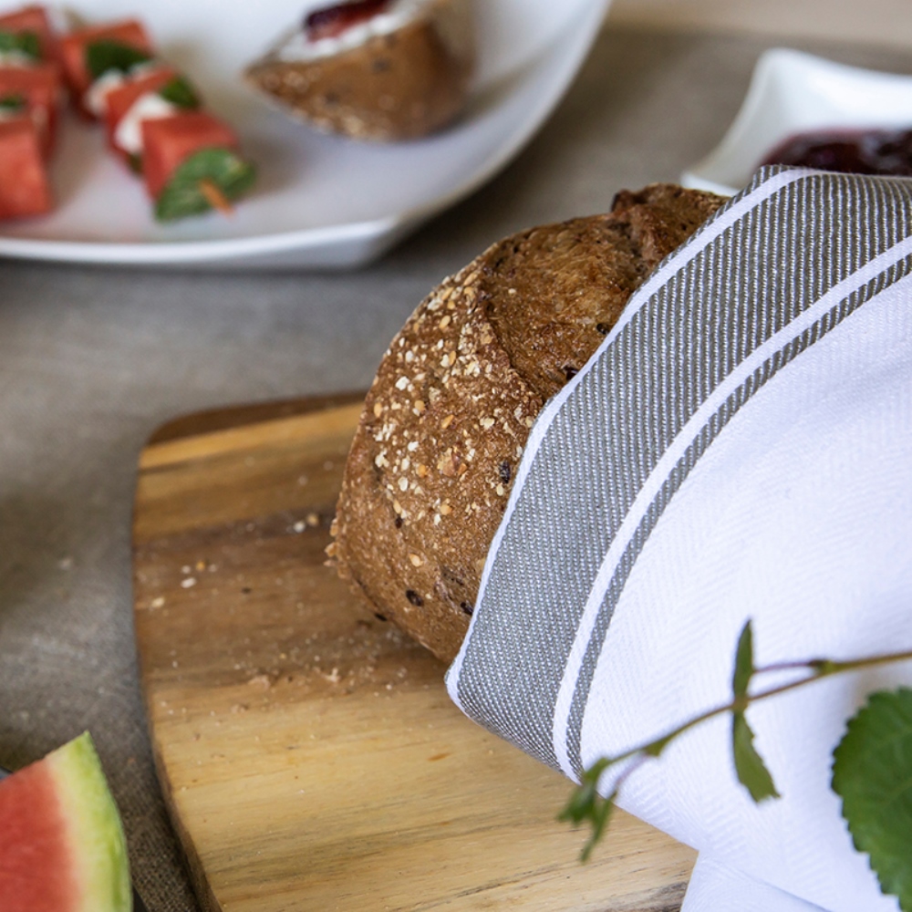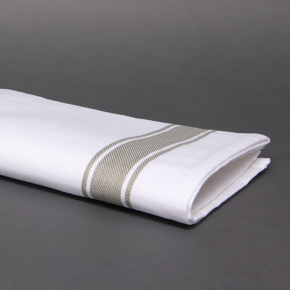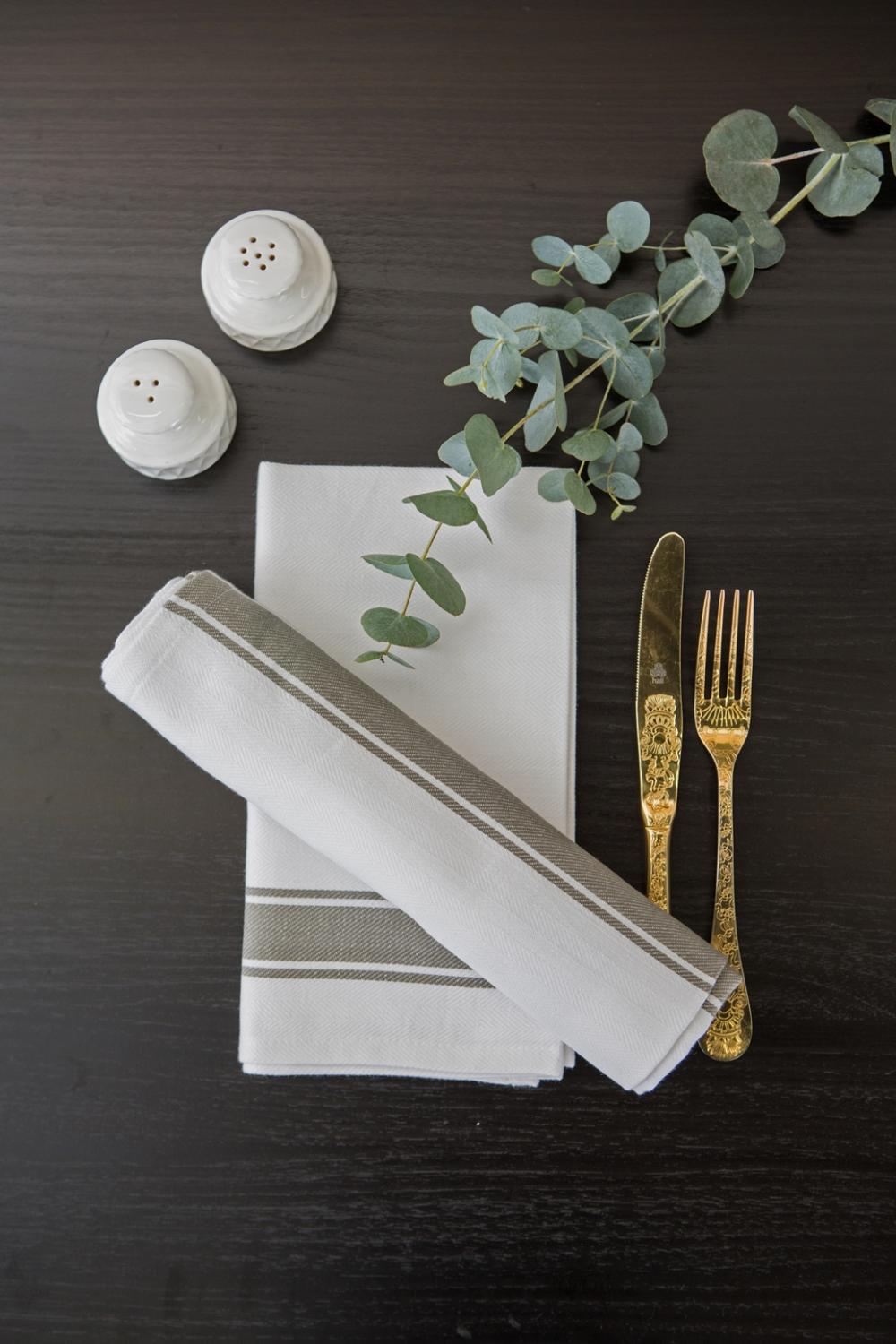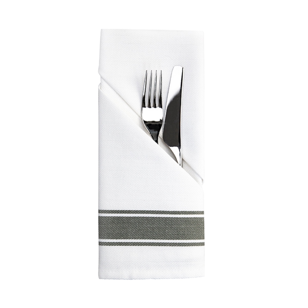 Tygservett Vincent från Fritz Magnus har en stilren design med diskret fiskbensstruktur och en elegant olivgrön rand. Ge dukningen olika utseende genom att vika randen på längden eller tvären. Storlek: 50x50 cm.
