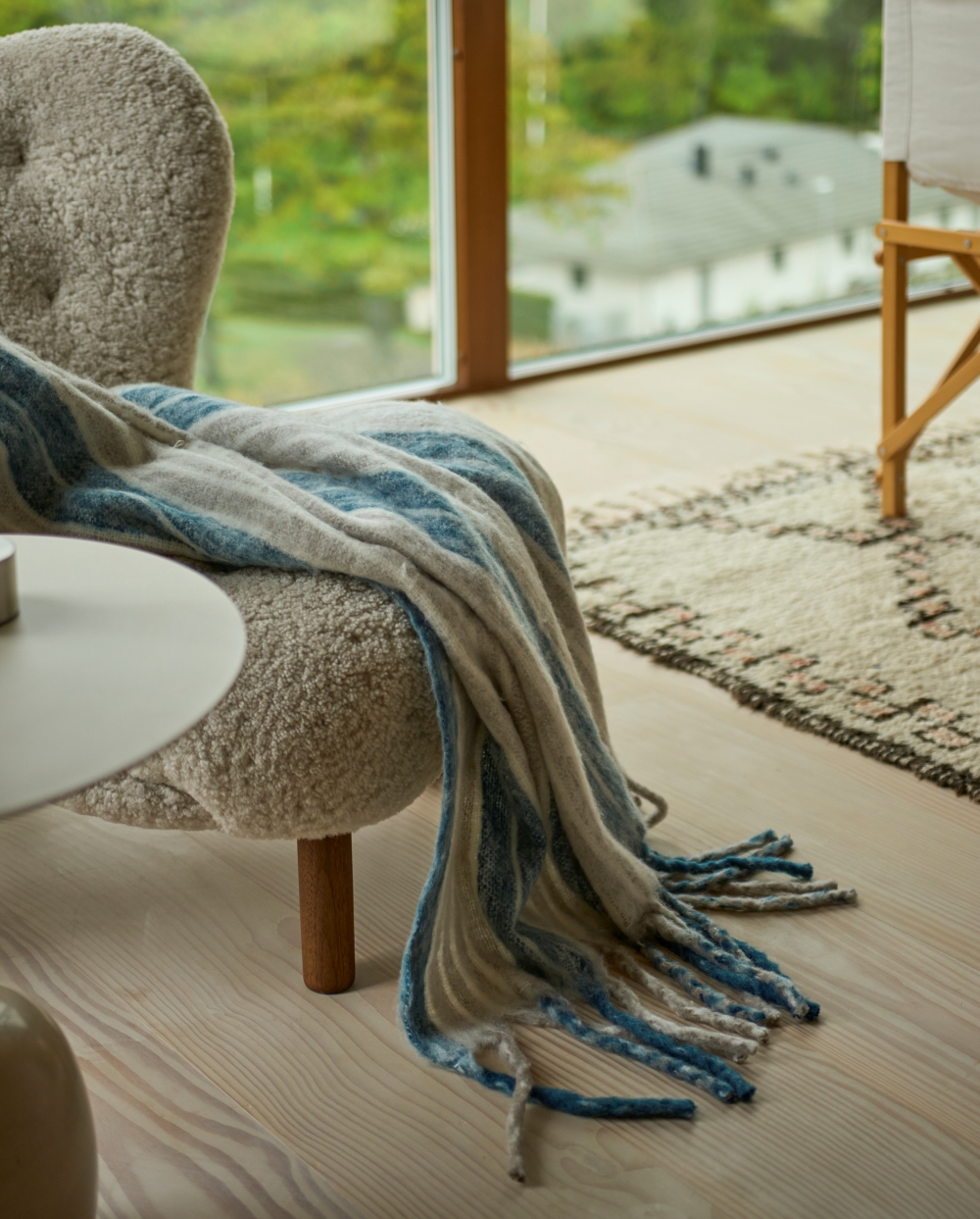 Pläd Tanum från Kosta Linnewäfveri är vävd i en blandning av 30% ull och 70% akryl som ger en mjuk och följsam känsla samtidigt som den behåller sin slitstyrka. Pläden har ett randigt mönster i dämpade blå och sandfärgade toner som skapar ett mjukt och harmoniskt uttryck.