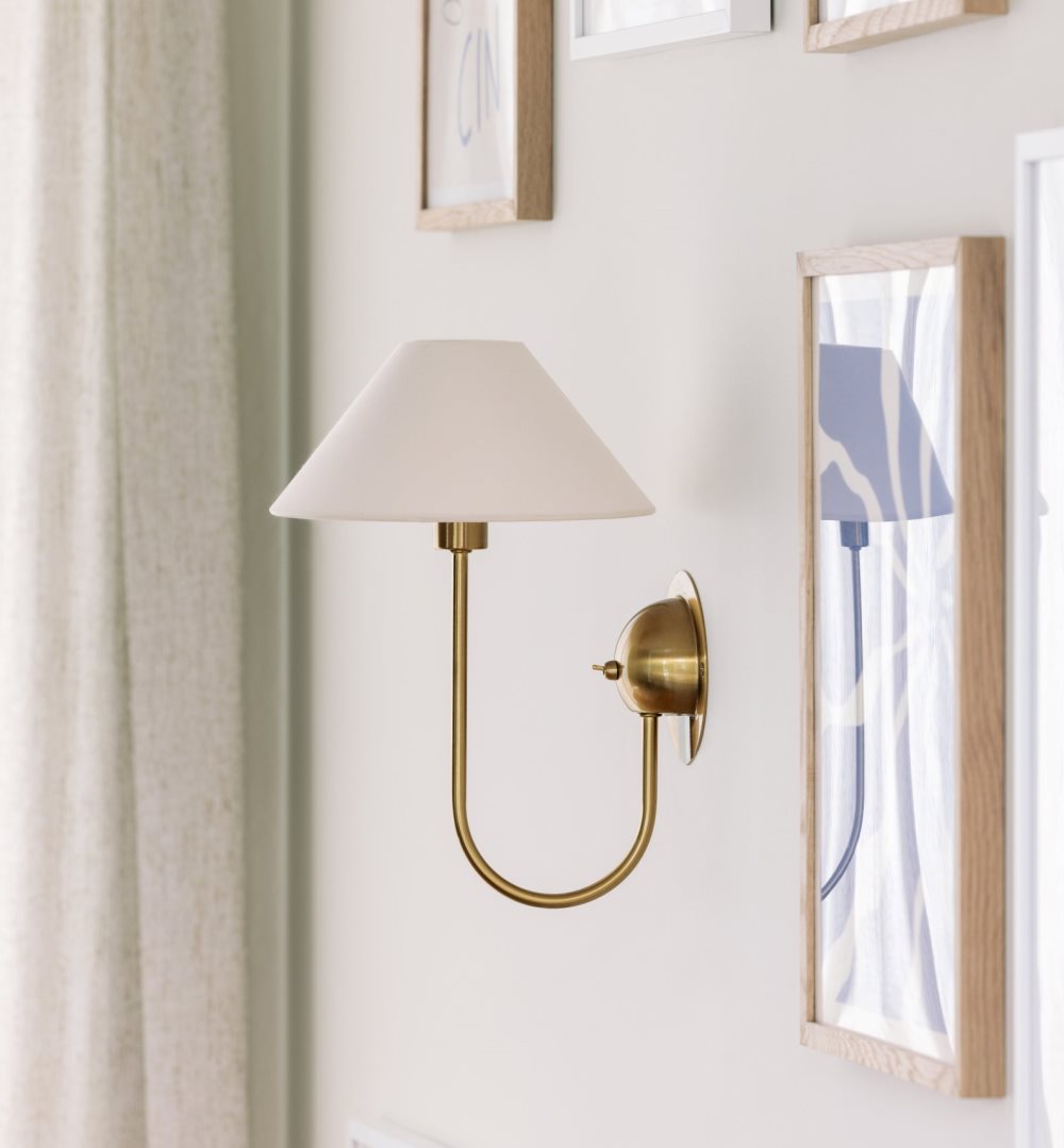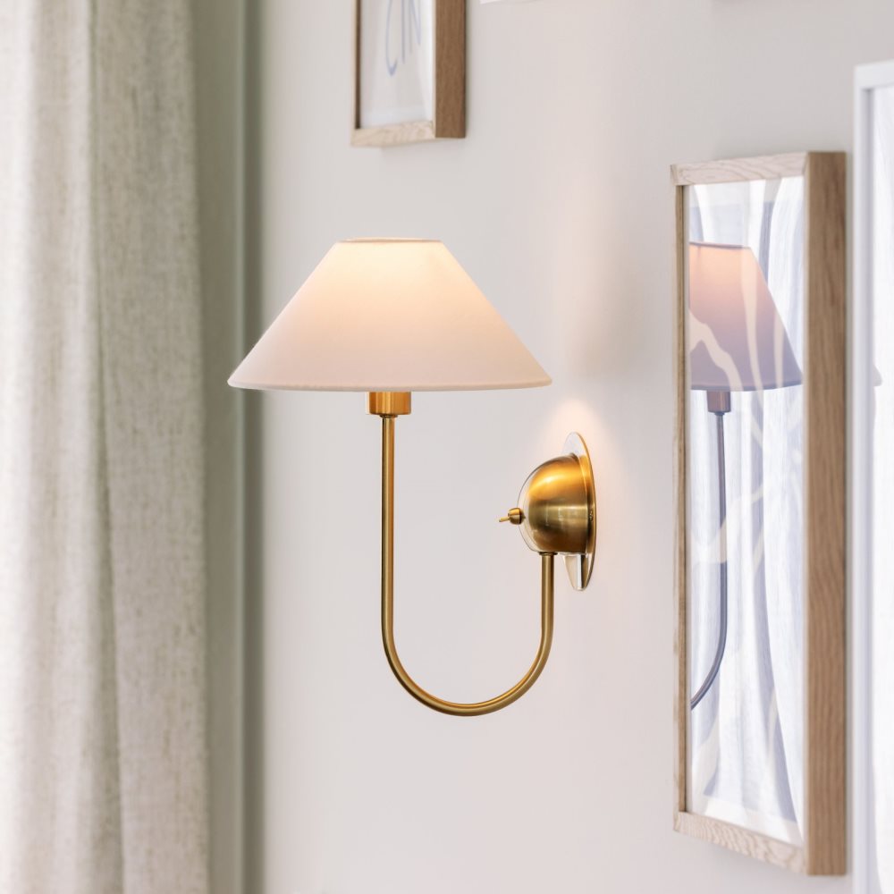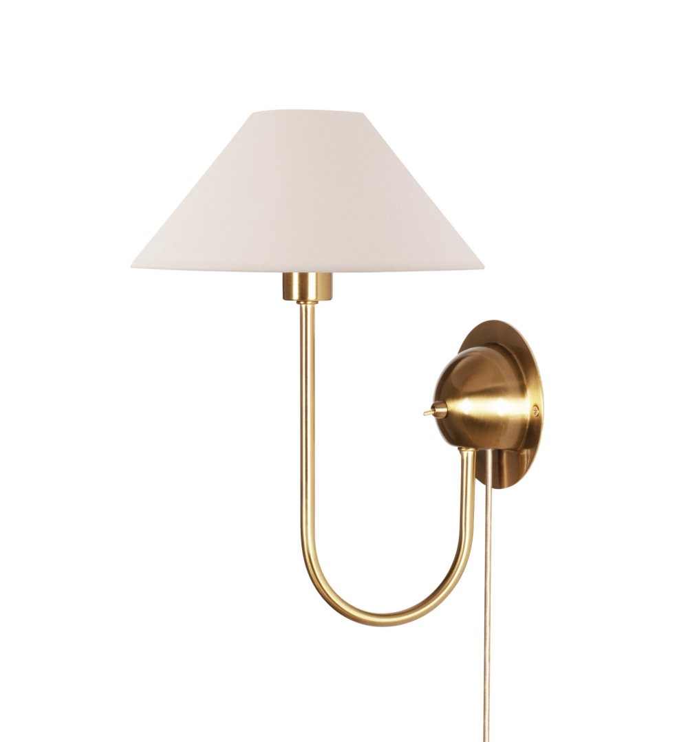Vägglampa Iris från Globen Lighting har en elegant design som förenar stil med praktisk belysning. Den borstade mässingsfärgade metallkonstruktionen ger ett elegant uttryck, medan den matchande krämfärgade bomullsskärmen med ringfäste sprider ett mjukt och behagligt ljus. Perfekt för både sovrum, hall och läshörnor. Den levereras med en 2 meter beige kabel i pärlemorfärg och har en smidig brytare direkt på armaturen. Den kan enkelt användas för fast installation om så önskas. Ljuskälla ingår ej.