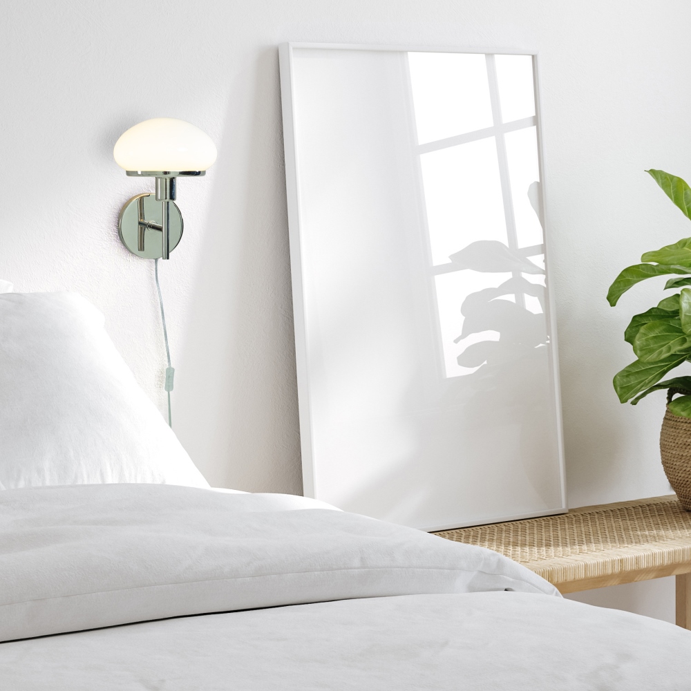 Vägglampa New August från Aneta Lighting har en elegant design i silverfärgad metall med blankt vitt glas. Den tidlösa designen gör den till en vacker inredningsdetalj som passar i de flesta rum och inredningsstilar.