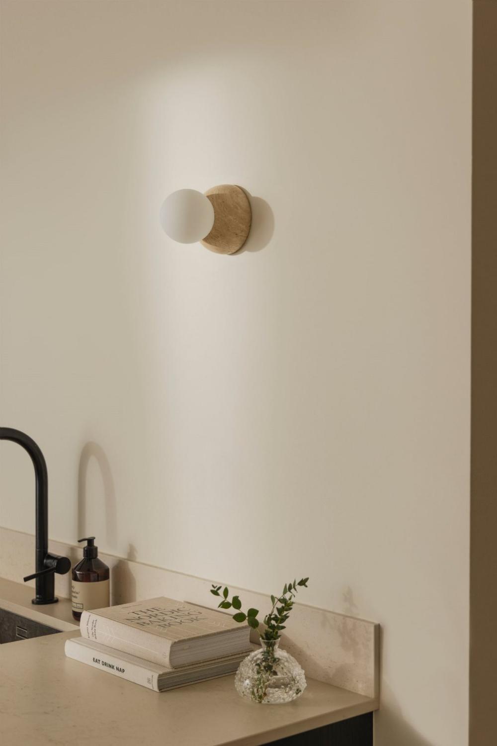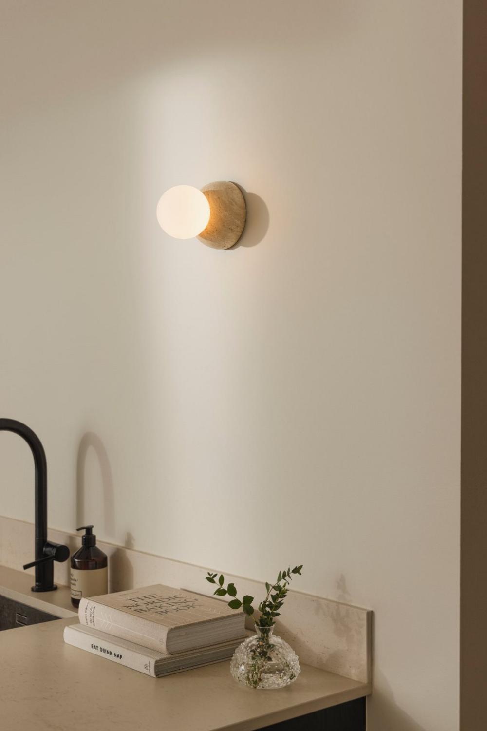 Vägglampa/plafond Torrano från Globen Lighting har en vacker och tidlös design, tillverkad av solid beige travertin. Varje lampa är unik då stenen är ett naturmaterial som kan variera i både färg och struktur. Designen kompletteras av en elegant glaskupa i mattvitt glas som skruvas fast. Tack vare sin IP44-klassificering är Torrano perfekt anpassad för fuktiga miljöer som badrum. Dess mångsidighet gör att du kan använda den både som en vägg- och taklampa.