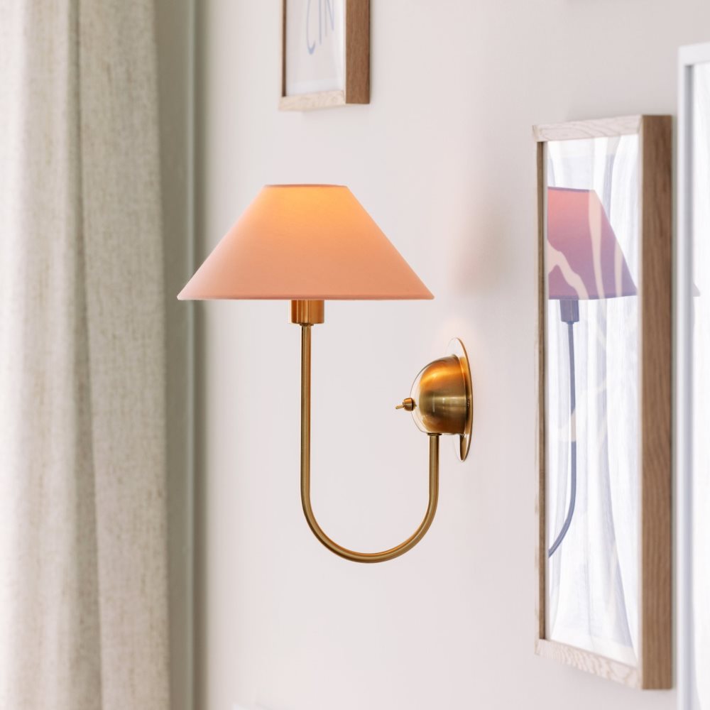 Vägglampa Iris från Globen Lighting har en elegant design som förenar stil med praktisk belysning. Den borstade mässingsfärgade metallkonstruktionen ger ett elegant uttryck, medan den matchande rosa bomullsskärmen med ringfäste sprider ett mjukt och behagligt ljus. Perfekt för både sovrum, hall och läshörnor. Den levereras med en 2 meter beige kabel i pärlemorfärg och har en smidig brytare direkt på armaturen. Den kan enkelt användas för fast installation om så önskas. Ljuskälla ingår ej.