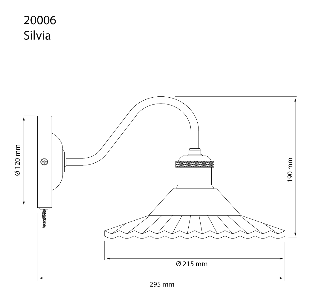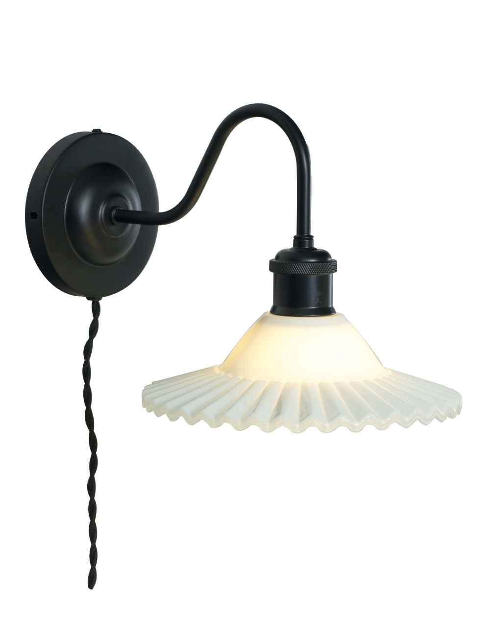 Vägglampan Silvia från Aneta Lighting har en vit glasskärm med vackert böljande volangkant och detaljer i svart metall. Med sin romantiska vintagestil blir vägglampan en fin inredningsdetalj i såväl klassiska, lantliga som moderna hem.
