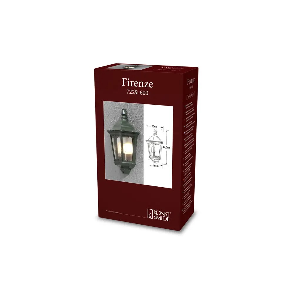 Vägglykta/väggplafond Firenze från Konstsmide har en tidlös design och ger din fasad en elegant och hemtrevlig känsla. Den klassiska designen i grön, hållbar aluminium kombineras med klart glas som sprider ett mjukt och inbjudande ljus. Placera den vid entrén, altanen eller garageuppfarten för att skapa en harmonisk och trygg atmosfär året runt. Vägglyktan passar lika bra på moderna som på traditionella fasader. Rekommenderad ljuskälla: E27, max 100W. Ljuskälla ingår ej.