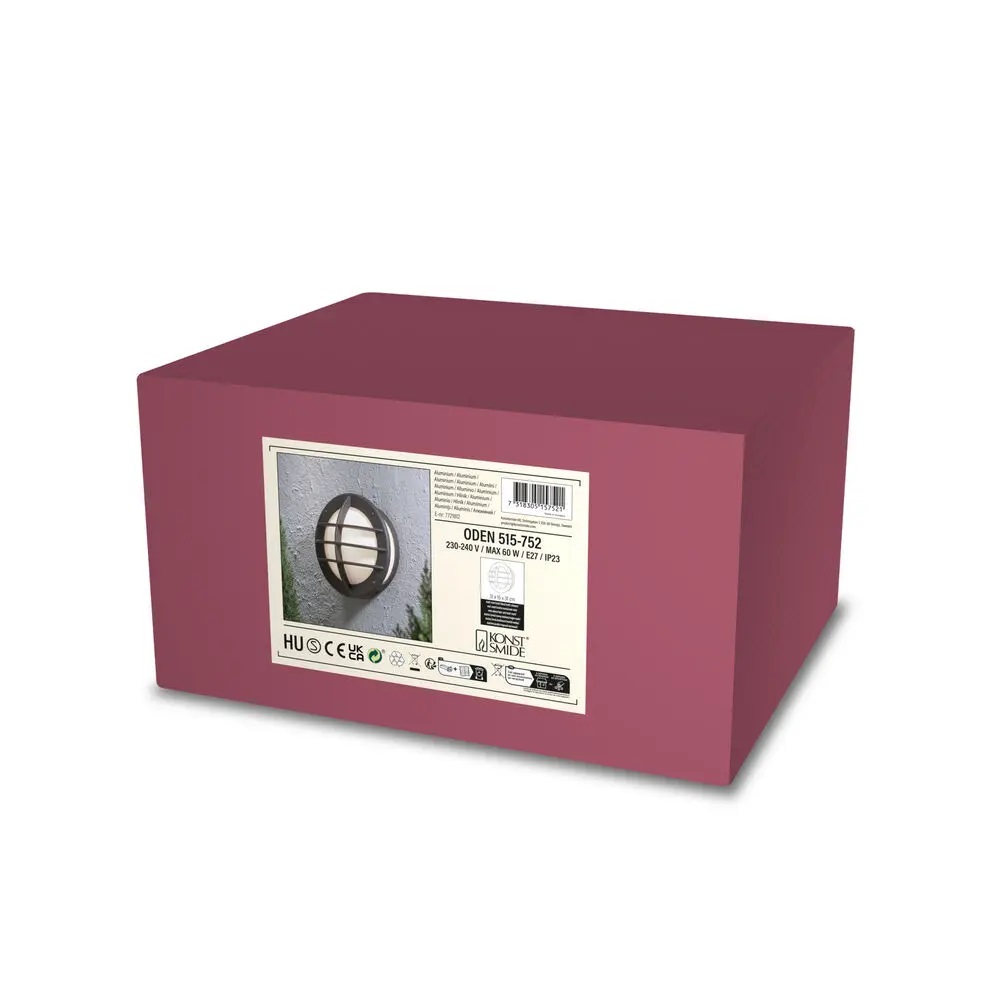 Vägglampa Oden svart från Konstsmide har en rund form i svart mattlackad aluminium med ett opalfärgat akrylglas bakom ett skyddande galler, vilket ger ett jämnt och behagligt ljus. Den passar utmärkt vid entréer, fasader och i trädgårdar och bidrar till en stämningsfull utomhusmiljö. Tillverkad i hög kvalitet med IP23-klassning, vilket gör den tålig mot väder och vind. Rekommenderad ljuskälla: E27, max 60W. Ljuskälla ingår ej.
