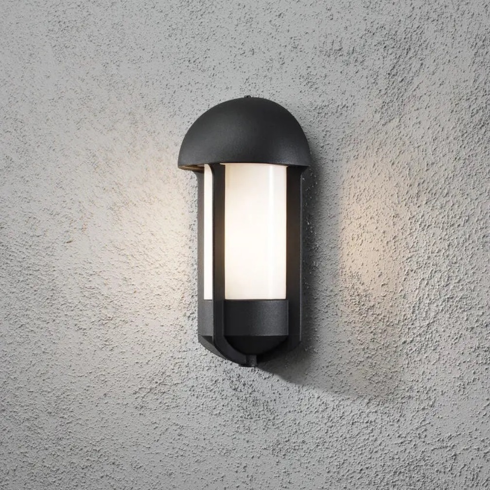 Vägglampa Tyr svart från Konstsmide är en modern och stilren fasadbelysning som skapar ett behagligt, bländfritt ljus vid entrén eller på fasaden. Lampan sprider ljuset jämnt åt sidorna och framåt, vilket ger en mjuk och inbjudande ljusbild. Den svarta aluminiumfinishen tillsammans med det opalfärgade glaset gör Tyr till ett stilfullt val som smälter in i både moderna och tidlösa miljöer. Till Tyr rekommenderas en ljuskälla med en E27 sockel, max 60W. Ljuskälla ingår ej.