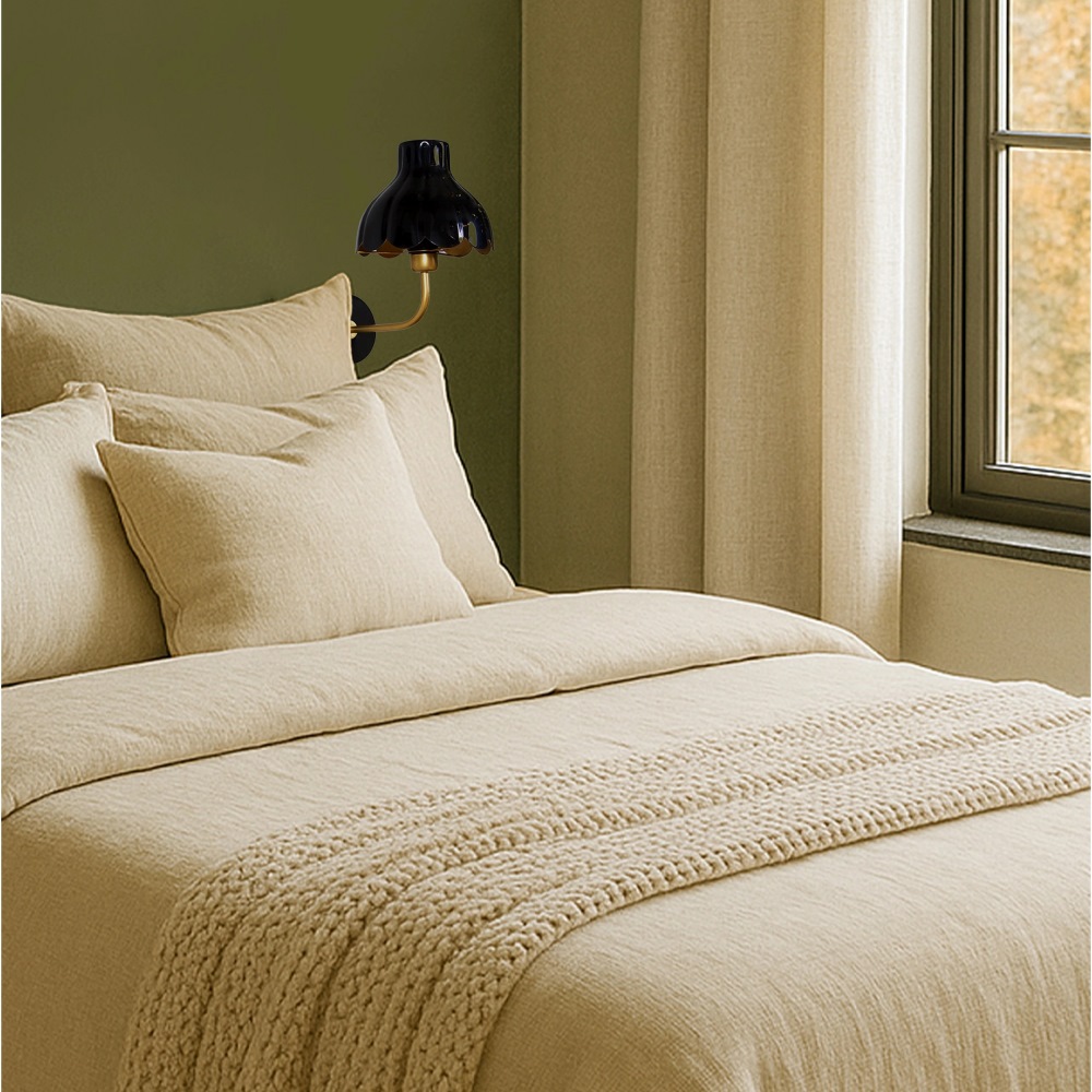 Vägglampa Wells från PR Home har en handgjord design med charmiga detaljer i svart metall och en varm guldfärgad insida. Den vackra formen är hämtat från en blomma och har en romantisk och härlig design. Den ger ett mjukt, stämningsfullt sken och passar perfekt i sovrum, hall eller som dekorativ inredningsdetalj i vardagsrummet. Wells levereras med en 1,6 meter svart plastsladd med strömbrytare. Till vägglampan rekommenderas en ljuskälla med E27 sockel, max 25W. Ljuskälla ingår ej.