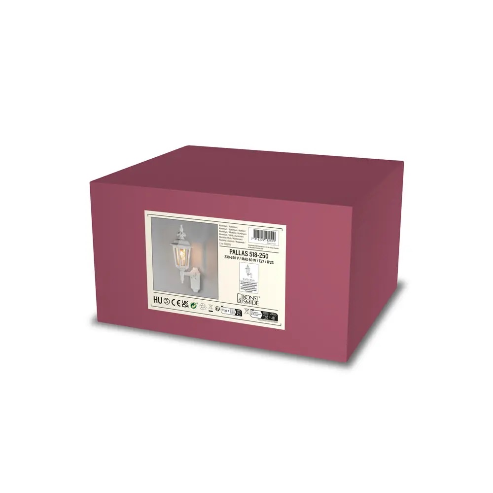 Pallas vägglykta vit från Konstsmide har en klassisk design som skapar en inbjudande atmosfär vid din entré, fasad eller uteplats. Denna uppåtriktade vägglykta i klassisk stil är tillverkad av lackad vit aluminium och har klart glas, vilket ger ett vackert och funktionellt ljus. Till Pallas rekommenderas en ljuskälla med en E27 sockel, max 60W. Ljuskälla ingår ej.