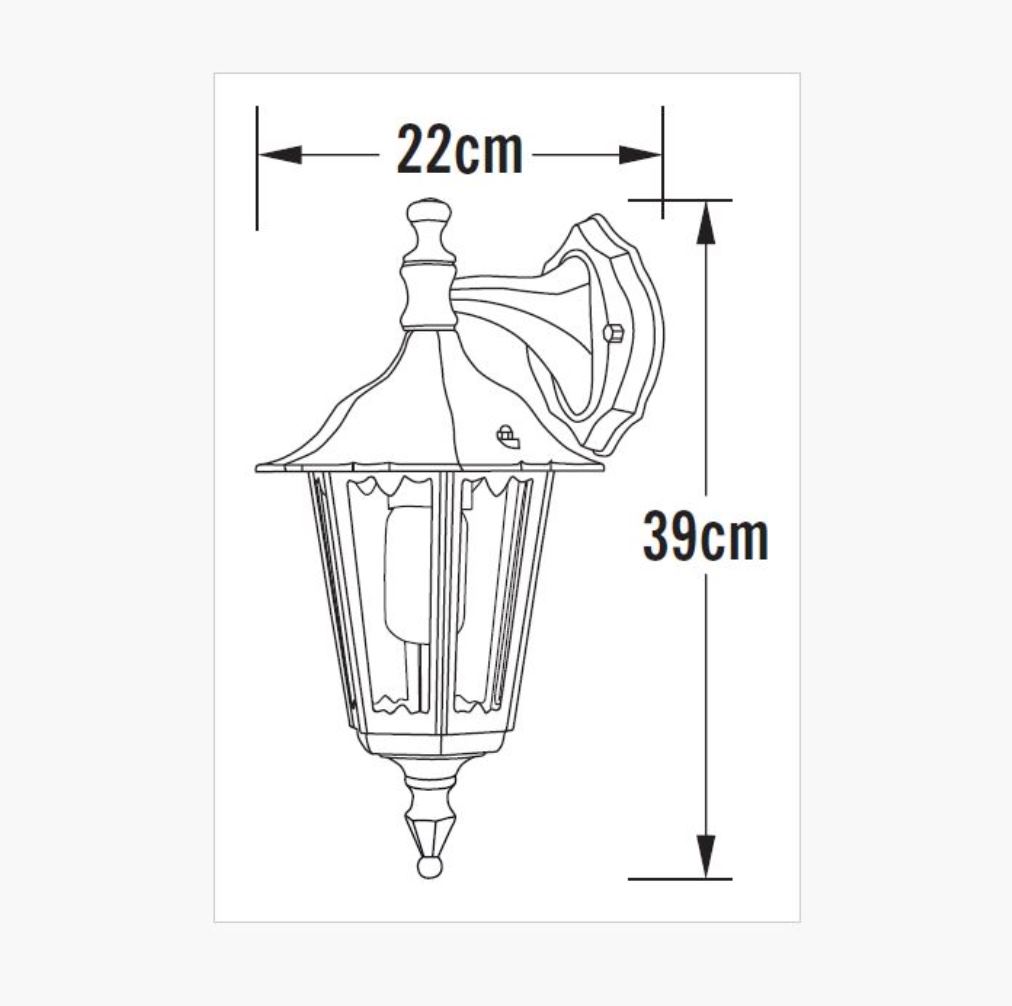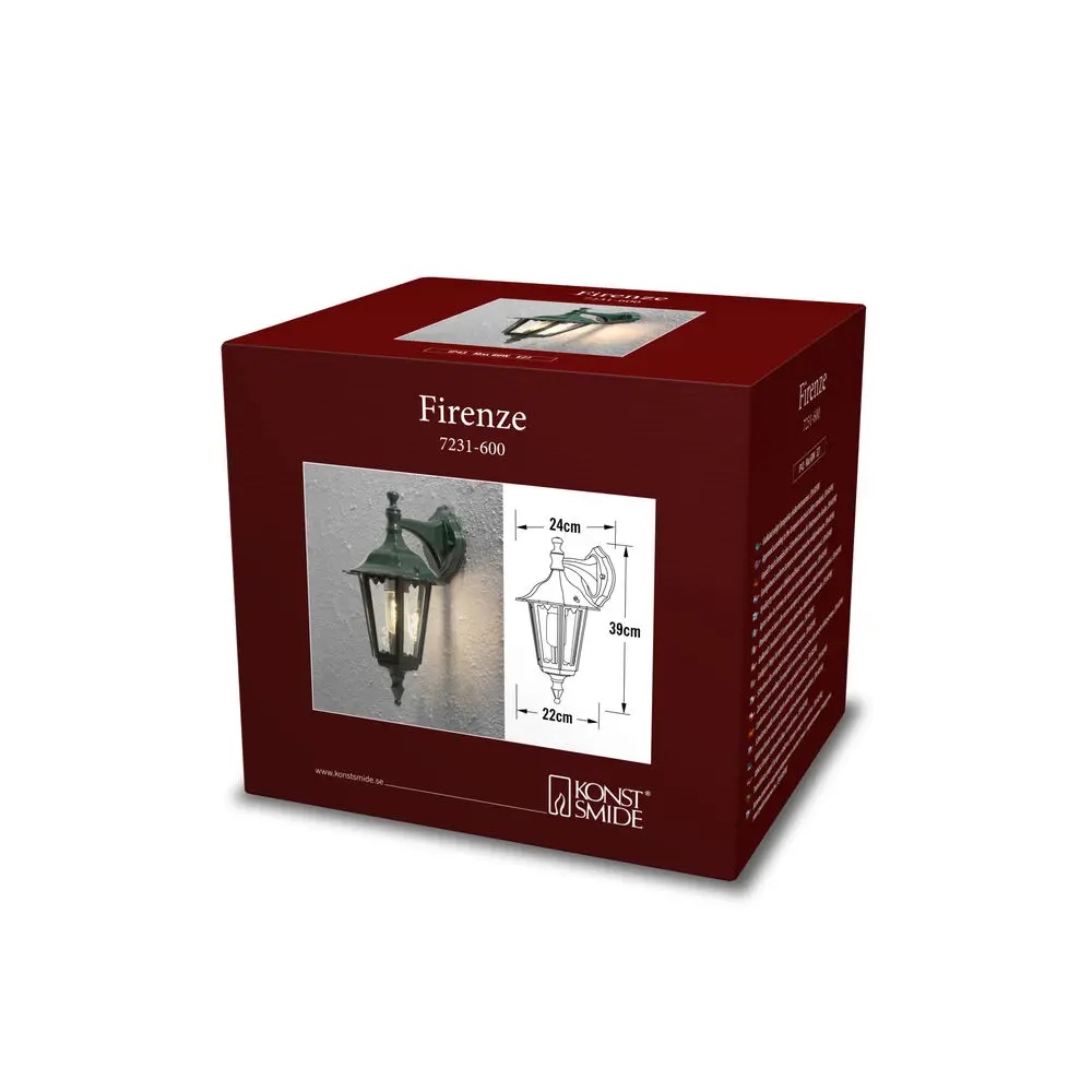 Fasadbelysning Firenze med IP43 klassning från Konstsmide som skapar en välkomnande och klassisk känsla vid din entré, altan eller husfasad. Vägglyktan är tillverkad i grön aluminium och har en design där ljuskällan hänger nedåt, vilket ger ett behagligt och funktionellt ljus utan att blända. Rekommenderad ljuskälla: E27, max 60W. Ljuskälla ingår ej.
