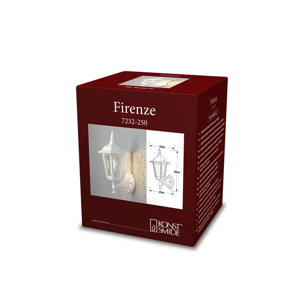 Fasadbelysning Firenze med IP43 klassning från Konstsmide som skapar en välkomnande och klassisk känsla vid din entré, altan eller husfasad. Vägglyktan är tillverkad i vitlackerad aluminium där ljuskällan är riktad uppåt, vilket passar bra i tidlösa miljöer. Rekommenderad ljuskälla: E27, max 60W. Ljuskälla ingår ej.