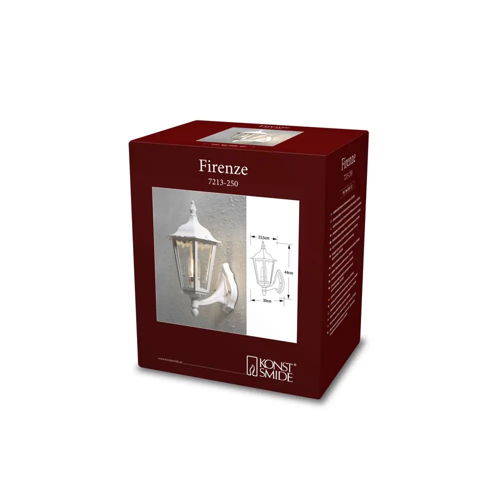 Fasadbelysning Firenze med IP43 klassning från Konstsmide är en klassisk fasadbelysning där ljuskällan är riktad uppåt, vilket ger ett traditionellt utseende som passar i tidlösa miljöer. Vägglyktan är tillverkad i vit aluminium och passar bra i tidlösa miljöer. Rekommenderad ljuskälla: E27, max 60W. Ljuskälla ingår ej.