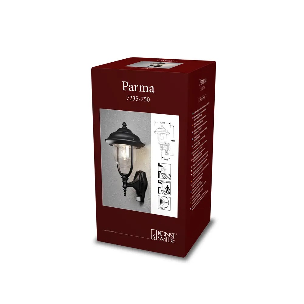 Vägglykta Parma från Konstsmide är en klassisk och hållbar utomhusbelysning i svartlackerad aluminium med rörelsevakt/sensor och klart glas. Den dekorativa designen förstärker husets karaktär och passar perfekt vid entré, garage eller fasad. Rekommenderad ljuskälla: E27, max 60W. Ljuskälla ingår ej.